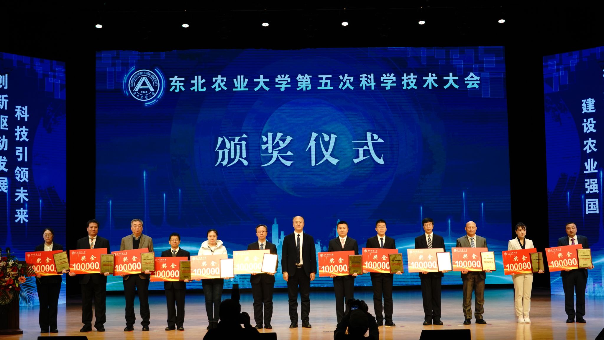 会上,举行了东北农业大学“十四五”以来代表性科技成果发布及表彰仪式。以视频形式发布了“大豆蛋白质柔性化加工理论创新与应用”“非粮型饲料资源挖掘与安全利用关键技术创新“圣泽901白羽快大型肉鸡配套系”“新型微生物天然产物植物生长调节剂谷维菌素创制与产业化应用”“农用化学品残留导致的黑土障碍消减技术”“益生菌产业技术研究与开发”“寒地粳稻重要性状遗传解析与新品种选育”“黑土耕地质量保护与肥效提升机械化技术及装备”“蓝靛果新品种及产业化关键技术研究与推广应用”“番茄优异种子资源创新和系列专用番茄新品种选育与产业化”“人工腐殖质”“禽类镉毒性机理及硒拮效应分子机制研究”“乡村振兴水平评价与对策研究”等代表性科技成果13项。付强为获奖成果颁发了纪念奖牌,为成果完成团队颁发了奖金。