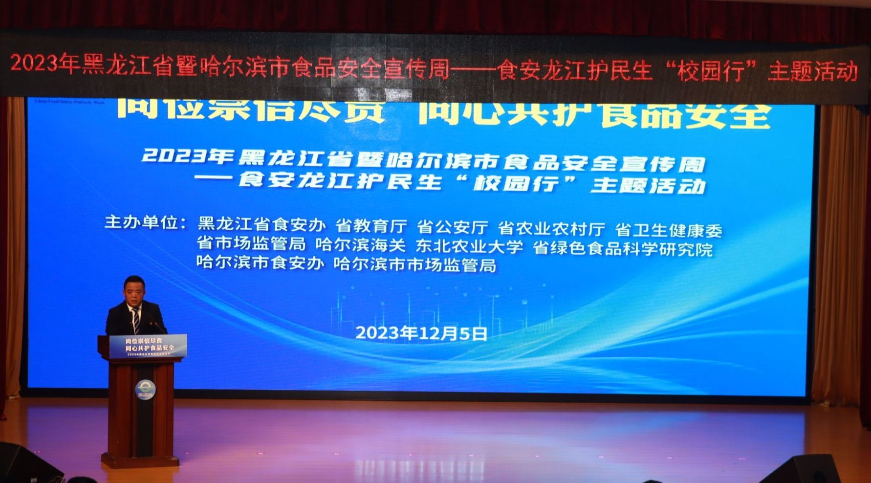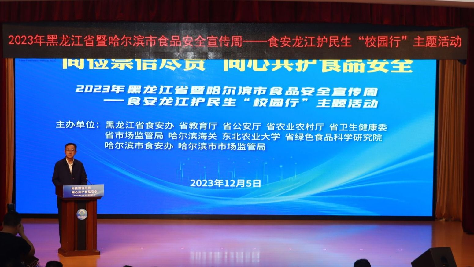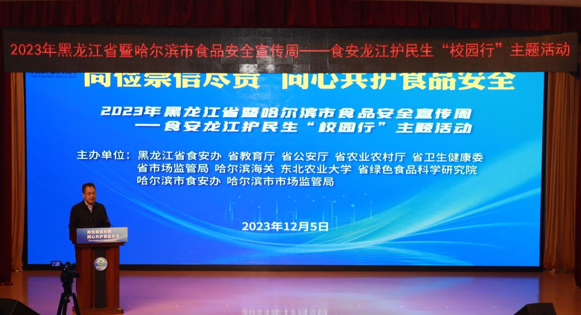12月5日上午,由黑龙江省食安办、省教育厅、省公安厅、省农业农村厅、省卫生健康委、省市场监管局、哈尔滨海关、东北农业大学、省绿色食品科学研究院、哈尔滨市食安办及哈尔滨市市场监管局主办的2023年黑龙江省暨哈尔滨市食品安全宣传周—食安龙江护民生“校园行”主题活动在东北农业大学图书馆一楼报告厅举办。省食安办主任、省市场监管局局长安虎贲,东北农业大学党委书记李长生、省教育厅副厅长董成、省公安厅食药环侦总队政委师大林、省农业农村厅二级巡视员尹文杰、省卫生健康委二级巡视员梁民琳、哈尔滨海关总检验师付维明、东北农业大学党委副书记贺景平,东北农业大学党委常委、统战部部长、省绿色食品科学研究院党委书记、院长高放,省市场监管局食品安全总监于孟超、省市场监管局二级巡视员王树海,哈尔滨市食安办主任、市场监管局局长郑晓辉,主办单位相关处(室、局)负责人,在哈部分高校和中小学负责人、食品安全总监以及我校学生代表共计470余人参加活动。活动由省食安办副主任、省市场监管局副局长刘猛主持。