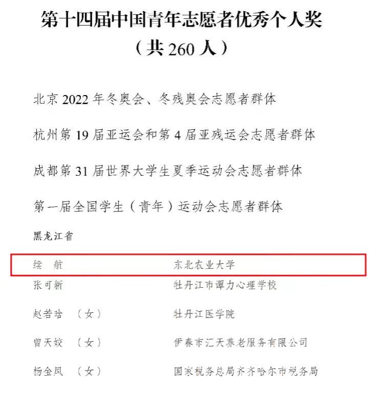 据悉,中国青年志愿者优秀个人奖、组织奖、项目奖由共青团中央、中国青年志愿者协会设立,是授予我国青年志愿服务工作领域的最高荣誉,每两年评选一次,自1996年以来已开展十四届评选表彰活动。截至目前,我校共2次获得中国青年志愿者“优秀项目奖”、1人获中国青年志愿者“优秀个人奖”。奖项及表彰活动设立以来,持续激励广大团员和青年志愿者、各级团组织和青年志愿者组织发扬志愿服务精神,为推进志愿服务事业高质量发展塑就榜样力量。此次获奖是对我校志愿服务工作的充分认可,是对我校青年志愿者投身社会公益事业一线、用行动传递爱心、用责任践行社会公益的充分肯定。接下来,校团委将继续发扬志愿服务精神,积极推动志愿服务工作持续健康发展,充分发挥志愿服务育人功能,不断培养学生“奉献、友爱、互助、进步”的志愿服务精神,引导东农青年积极投身国家建设和公益事业中去,树立崇高理想信念,提升融入社会的实践本领,在志愿服务中实现个人理想和人生追求。