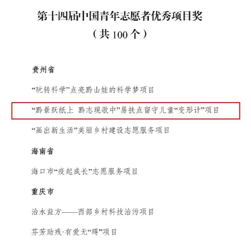 12月5日,由共青团中央、中国青年志愿者协会主办的第十四届中国青年志愿者优秀个人奖、组织奖、项目奖评选结果揭晓,我校中国青年志愿者第24届研究生支教团贵州龙里服务队队长续航荣获“第十四届中国青年志愿者优秀个人奖”,研究生支教团贵州龙里志愿服务队“黔景跃纸上 黔志现歌中”易扶点留守儿童“变形计”项目荣获“第十四届中国青年志愿者优秀项目奖”。