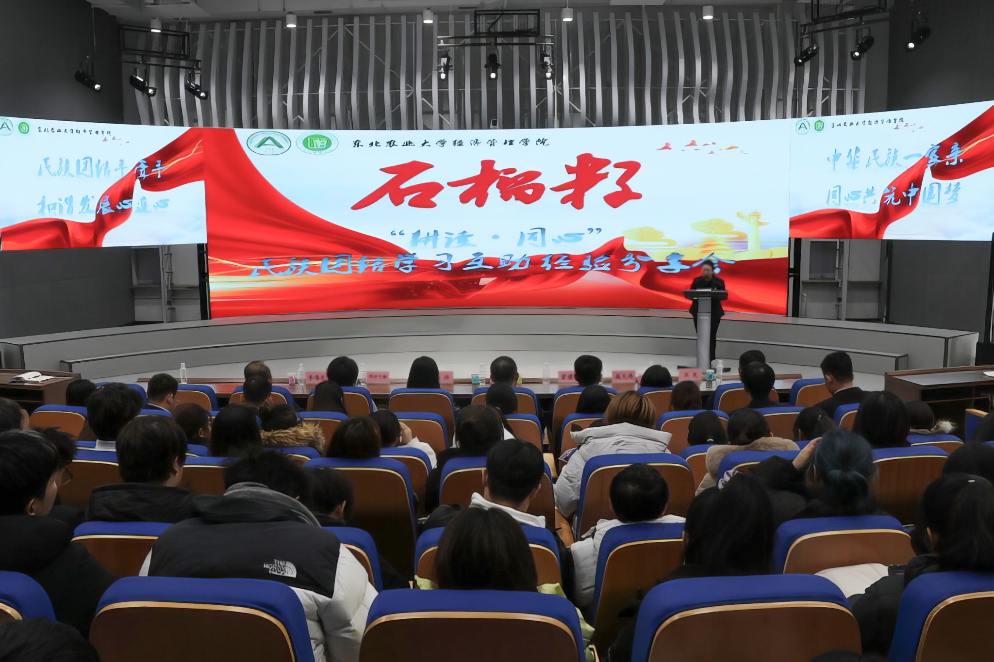 为深入学习贯彻习近平总书记关于加强和改进民族工作的重要思想,全面落实立德树人根本任务,进一步深化新时代高校民族团结进步教育,铸牢中华民族共同体意识,促进各民族学生交流交往交融,全面推进少数民族学生成长成才。12月15日中午,经济管理学院在成栋13楼报告厅举办石榴籽“耕读·同心”民族团结学习互助经验分享会,在学院560名各民族同学中邀请到了五位优秀代表,分享他们的“东农成长故事”,校党委常委、统战部部长,省绿色食品科学研究院党委书记、院长高放、校统战部副部长冯丹、学生工作部副部长宫建伟、经济管理学院党委副书记高天琦、学生工作部少数民族专职辅导员玛合巴勒、学院全体辅导员及各民族学生代表参加会议,分享会由经济管理学院学生工作办公室主任郭昕主持。