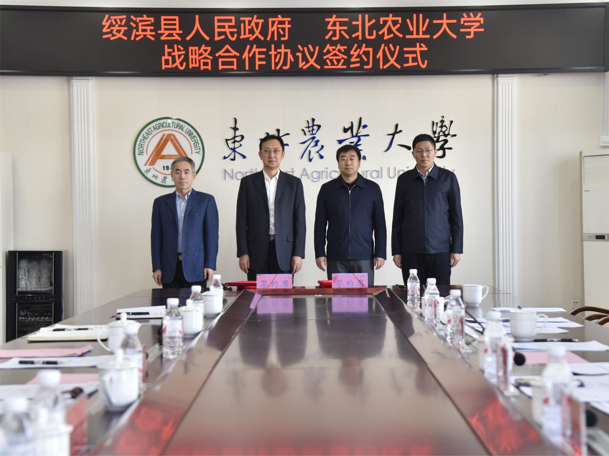 孙占峰与杜国明分别代表东北农业大学与绥滨县人民政府签署了战略合作协议。李长生与何佳共同见证签约。
