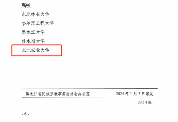 本次评选,全省共有70个地区和单位获评全省民族团结进步示范区示范单位。经过择优推荐、严格评审,东北农业大学与东北林业大学、哈尔滨工程大学、黑龙江大学、佳木斯大学获评全省民族团结进步工作示范高校。