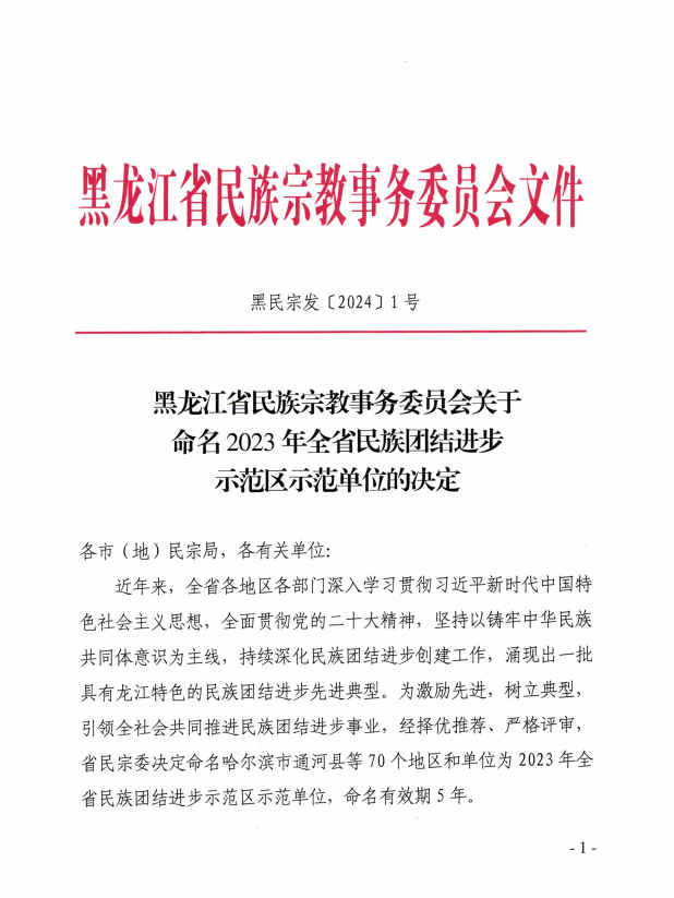 为全面贯彻党的二十大精神,坚持以铸牢中华民族共同体意识为主线,持续深化民族团结进步创建工作,激励先进、树立典型,黑龙江民族宗教事务委员会开展了2023年全省民族团结进步示范区示范单位评审工作,并于近日公布了《黑龙江省民族宗教事务委员会关于命名2023年全省民族团结进步示范区示范单位的决定》,东北农业大学获评“全省民族团结进步示范单位”荣誉称号。