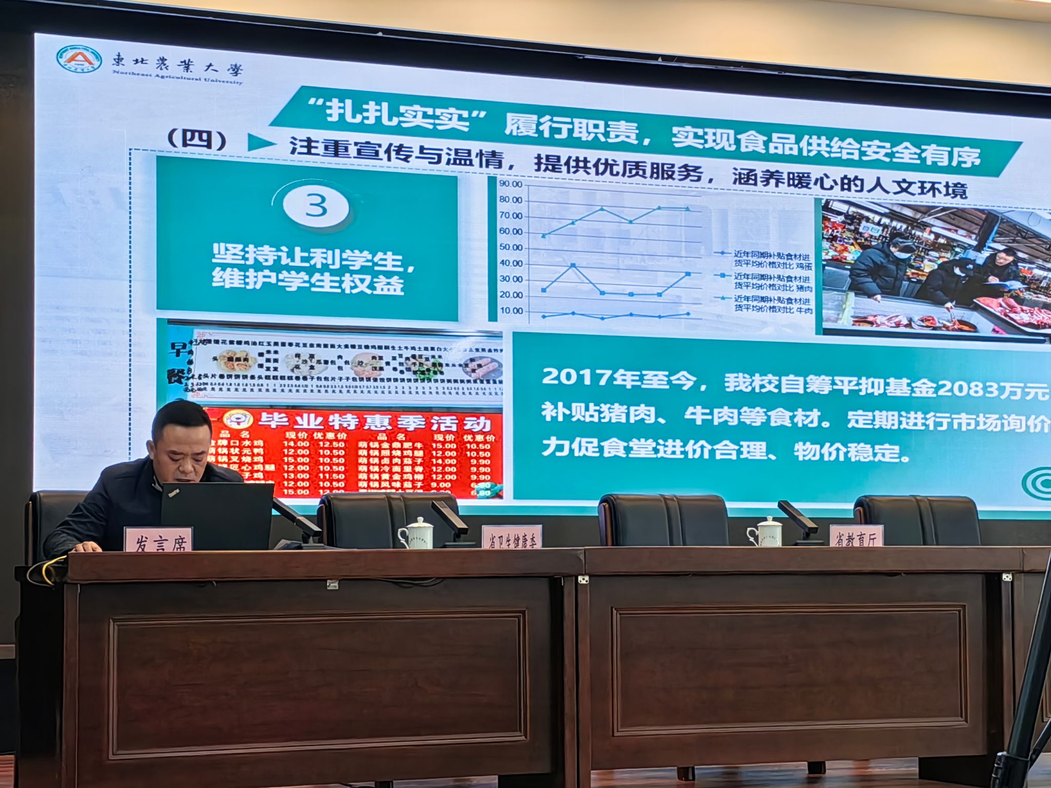 汪志君代表学校在大会上做典型发言。他从我校食堂服务师生、履行职责、谋划发展三个方面向全省学校、餐饮公司介绍东北农业大学饮食服务中心关于食品安全管理的经验做法。他表示,高校食堂是为师生提供饮食服务的场所,在校园常规运转中具有不可替代的地位,学校作为执行食品安全管控的重点单位,要竭尽全力当好“答题人”,迎接时代“出卷”,接受师生“阅卷”。一是要坚持培育“宏观视野”,讲政治,用理论,积极研究发展思路,将先进管理理念、经营模式引入校园,力求实现服务创新与社会接轨;二是要坚持站稳“人民立场”,同师生想在一起,办好学校餐厅,建设饮食品牌,满足师生多样化的服务需求;三是要坚持运用“底线思维”,务必做到食品安全万无一失,严抓关键点、关键人,推动工作流程不断向科学化、标准化发展。