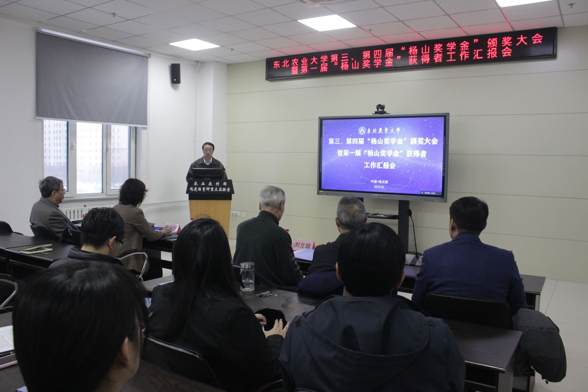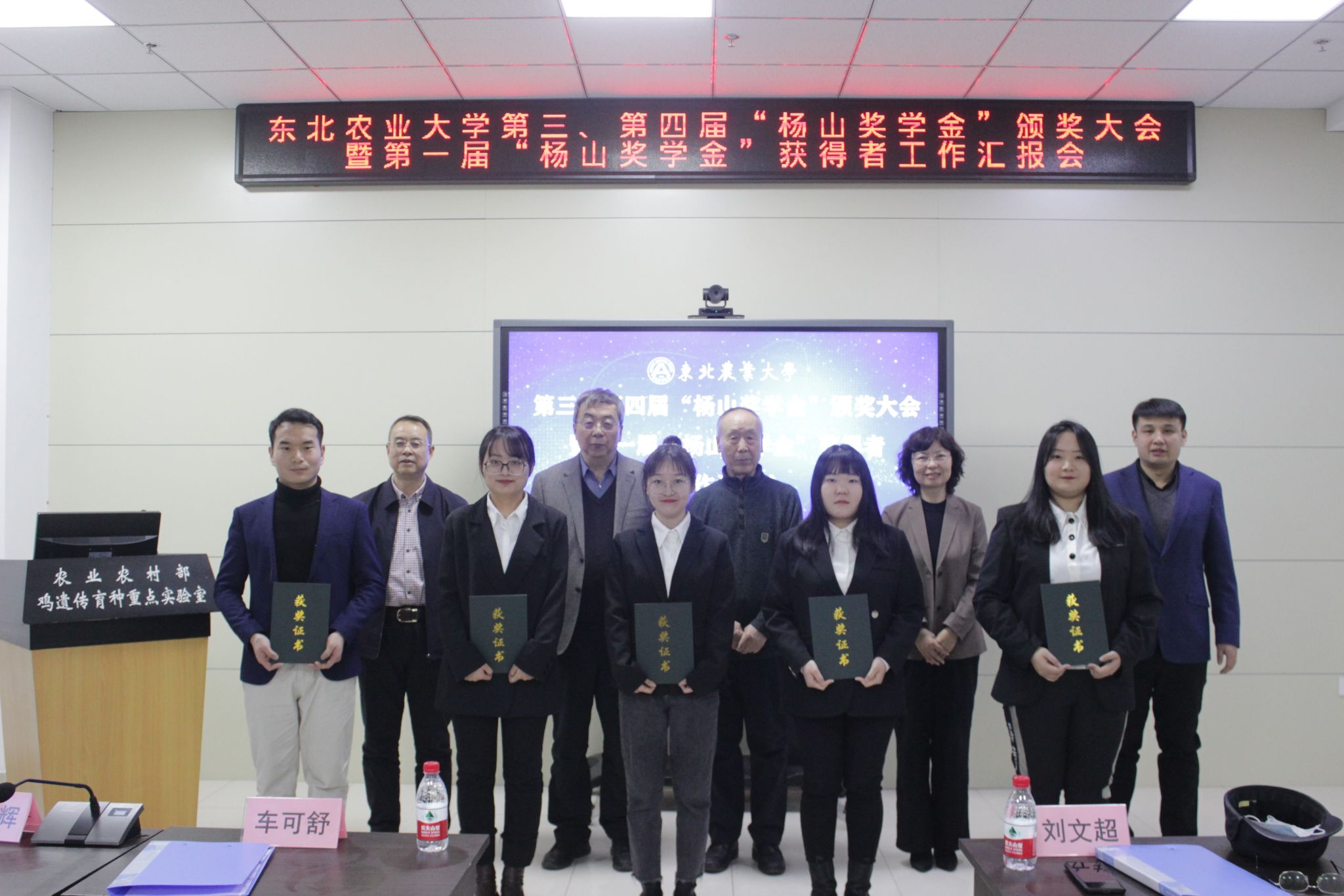 1月12日下午,第三、第四届“杨山奖学金”颁奖大会暨第一届“杨山奖学金”获得者工作汇报会在公共基础教学实验中心345会议室举行。东北农业大学校友工作办公室主任、校教育发展基金会秘书长车可舒、动物科学技术学院副院长姚玉昌、杨山教育基金理事会副理事长刘文超、杨山教育基金理事会副理事长钱先勇,杨山教育基金理事会秘书长李辉等出席了会议。会议由动物科学技术学院动物遗传育种与繁殖学科带头人、农业农村部鸡遗传育种重点实验室副主任王宁主持。王宁代表学科和重点实验室向莅临颁奖典礼的各位嘉宾和校友表示诚挚的欢迎,向获奖同学表示热烈的祝贺,向对杨山教育基金相关工作给予大力支持的学校、学院各级领导表示衷心的感谢。