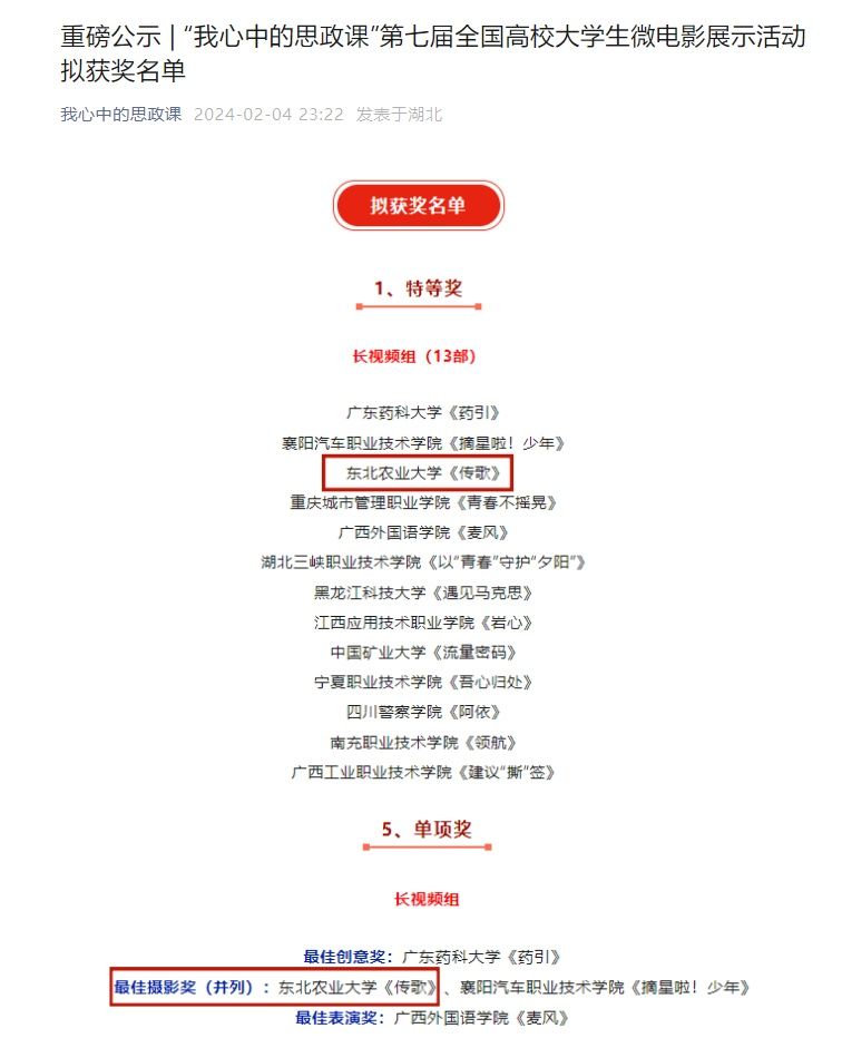 近日,第七届“我心中的思政课”全国高校大学生微电影展示活动评比结果重磅揭晓,由我校马克思主义学院制作的微电影《传歌》在本届大赛众多参赛作品中脱颖而出,拟获特等奖和单项最佳摄影奖两个奖项,再次取得突破性成绩。