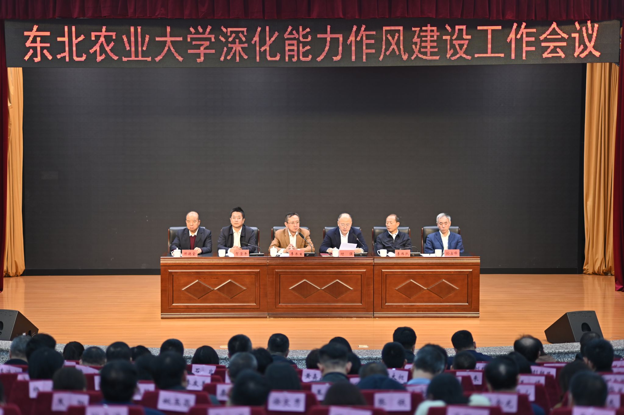 为深入学习贯彻习近平总书记关于能力作风建设重要论述,深入贯彻落实省委有关部署要求,扎实开展好深化能力作风建设“抓基层、打基础、强落实、见实效”活动,3月28日上午,东北农业大学深化能力作风建设工作会议在学校图书馆一楼报告厅召开。全体在校校领导,全校正、副处级干部参加会议。会议由校长付强主持。