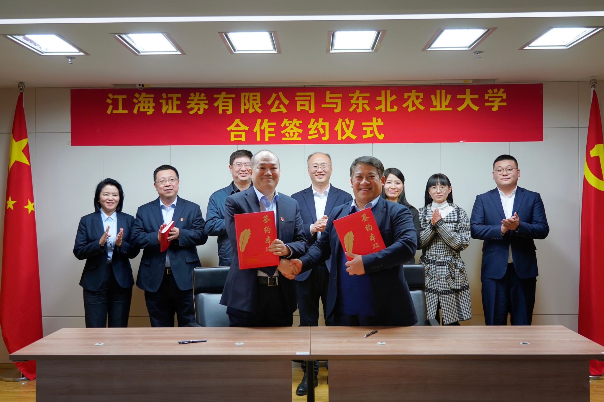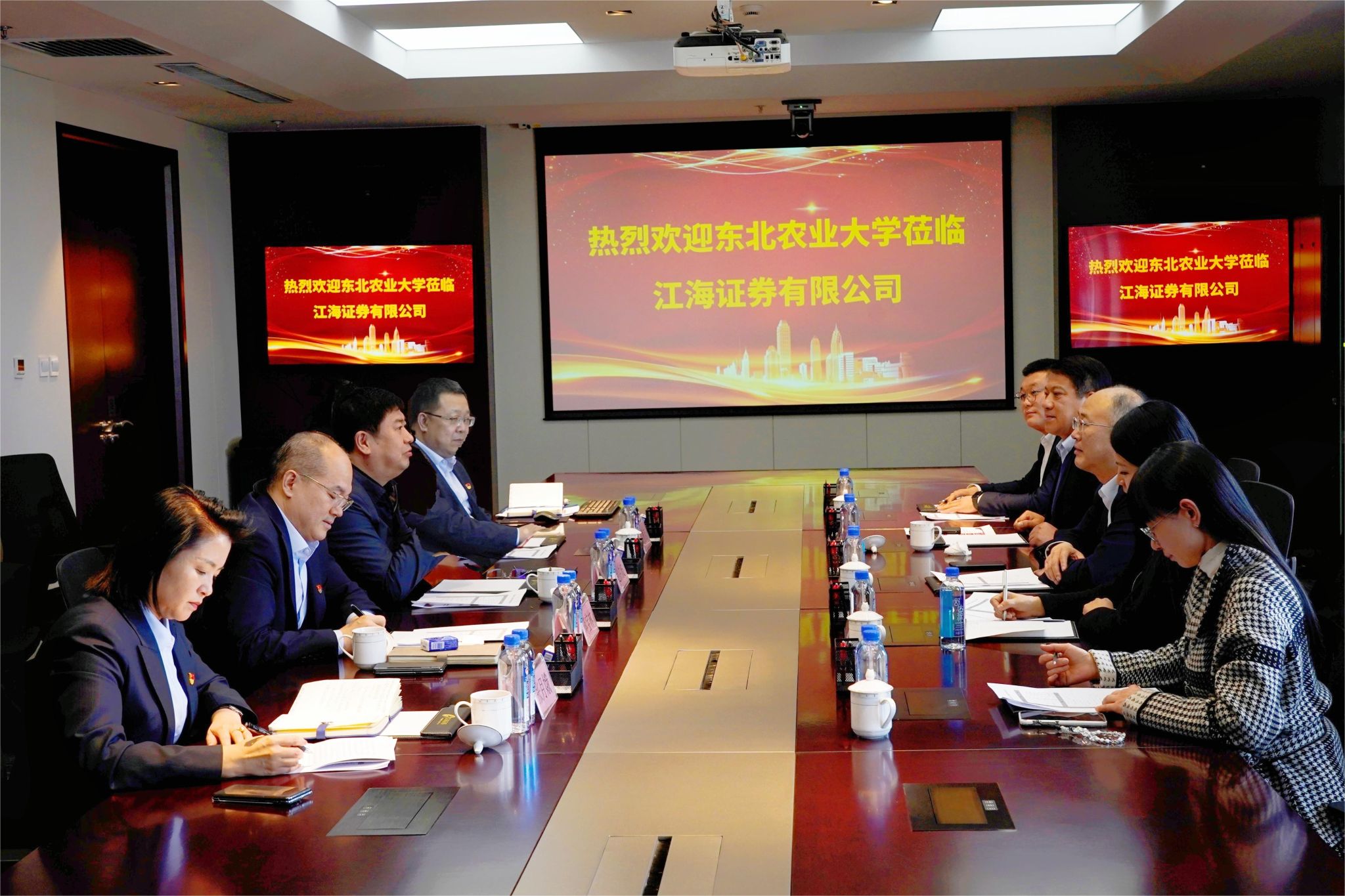 为深入贯彻落实党中央、国务院关于毕业生就业工作的决策部署,积极响应教育部、省教育厅高校书记校长访企拓岗促就业专项行动工作安排,4月1日东北农业大学校长付强带队赴江海证券有限公司走访座谈,持续深化校企交流合作,落实实习就业基地建设,助力学校毕业生高质量就业。招生就业处处长宋跃芬,国际文化教育学院院长卢铁光,党委副书记李昊书、辅导员张少奇参加调研。哈投集团董事长赵洪波、江海证券有限公司总裁蒋宝林,副总裁兼董事会秘书孔德志、纪委书记兼监事会主席张月娥参加座谈。