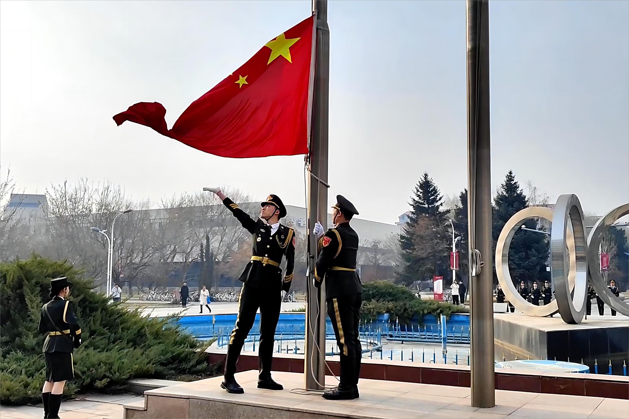 迎着东方的晨曦,怀着赤诚的敬意,国旗护卫队精神饱满、英姿勃发,以铿锵有力的步伐护送五星红旗入场。全体师生面向国旗肃立致礼。随着奏唱激昂的《义勇军进行曲》,师生们注视着五星红旗冉冉升起,在熠熠晨光中迎风飘扬。
