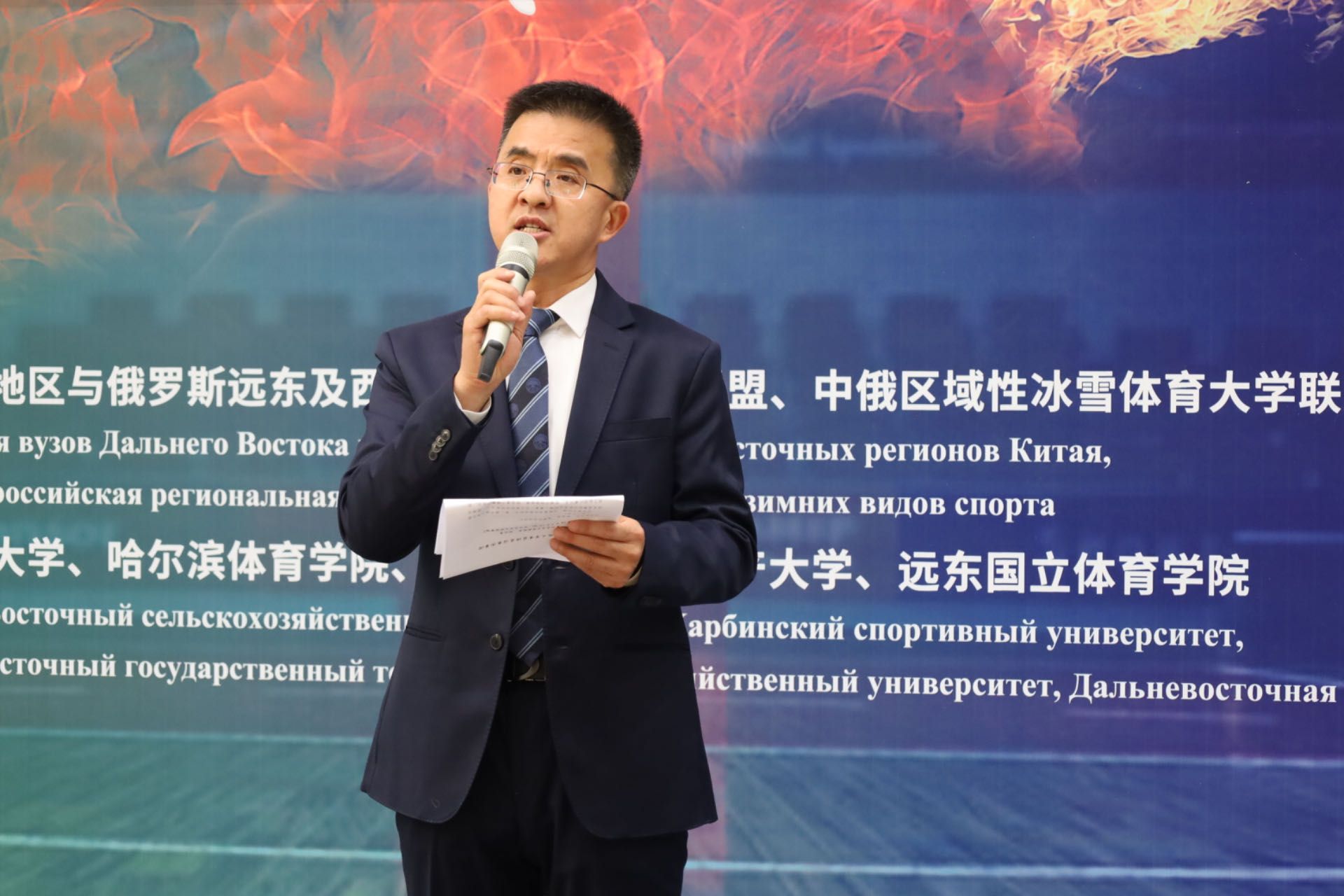 副校长刘竹青在闭幕式致辞。他表示,通过三天的比赛,中俄两国四所高校的运动员们用精湛的球技、默契的配合、昂扬的斗志,展示了青春活力和拼搏精神,用实际行动诠释了“友谊第一,比赛第二”的体育精神。此次中俄大学生篮球友谊赛,不仅是一场体育竞技的盛会,更是一次文化交流的盛宴,充分展现出中俄两国青年之间深厚的情谊。