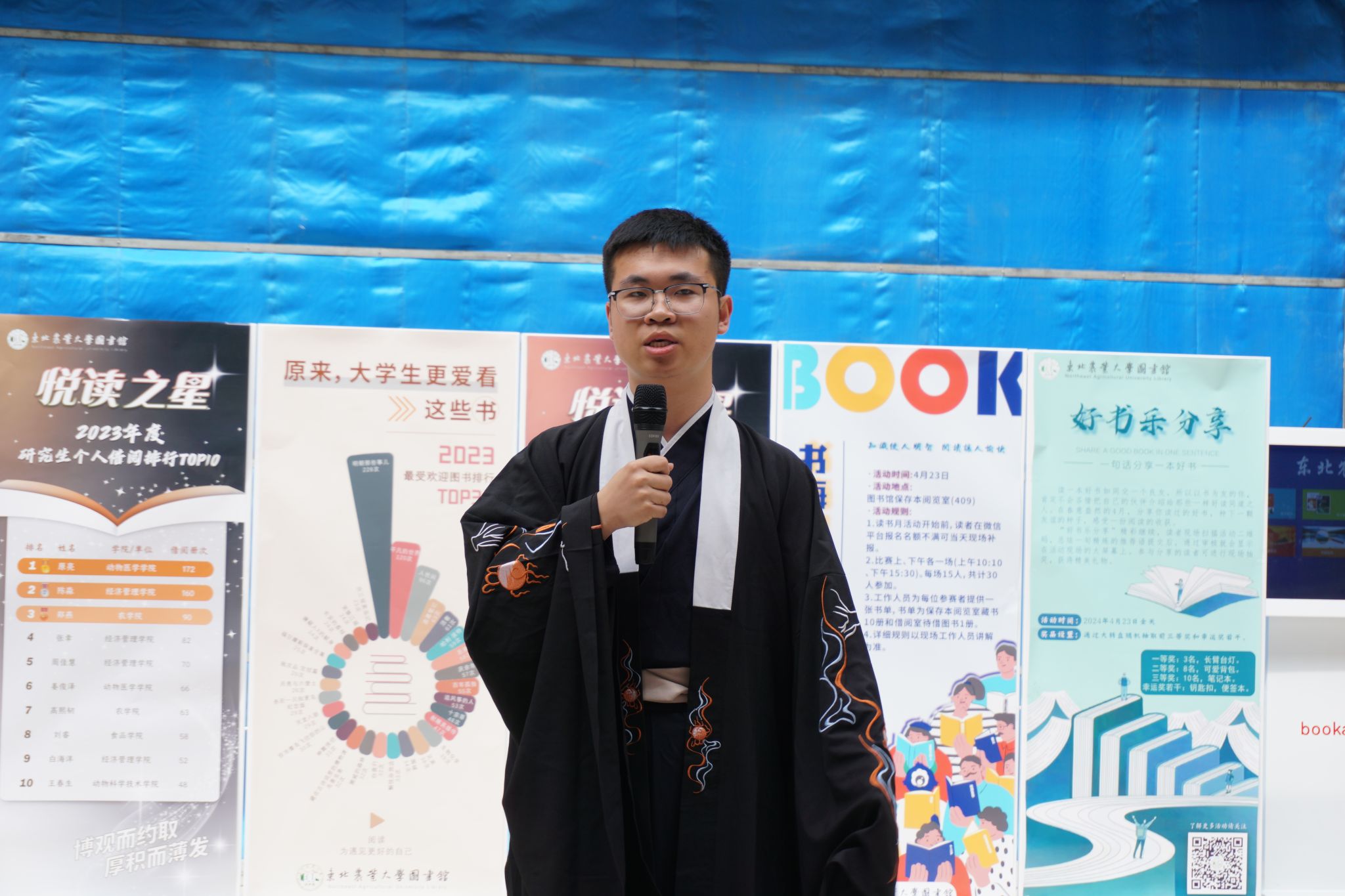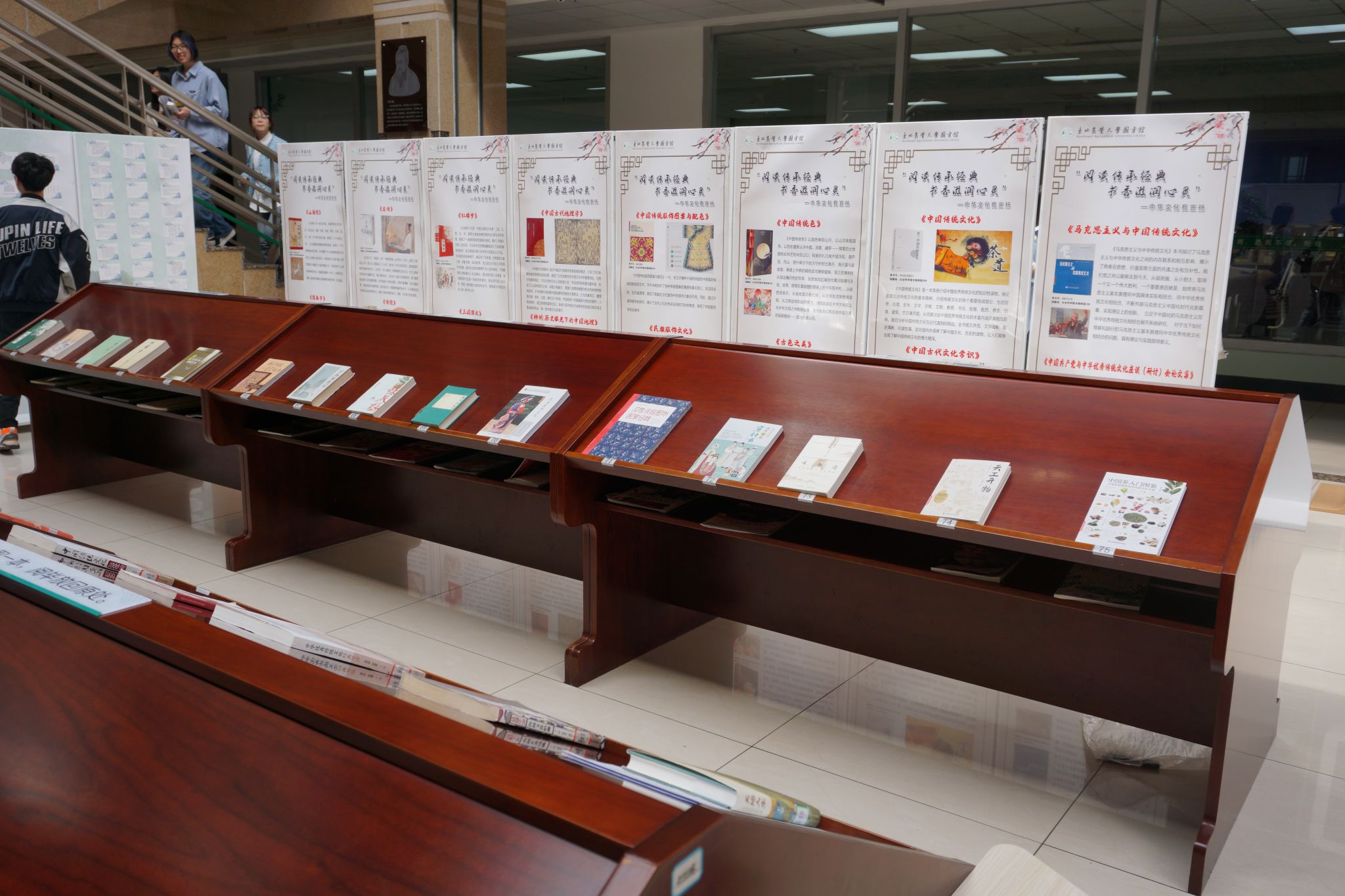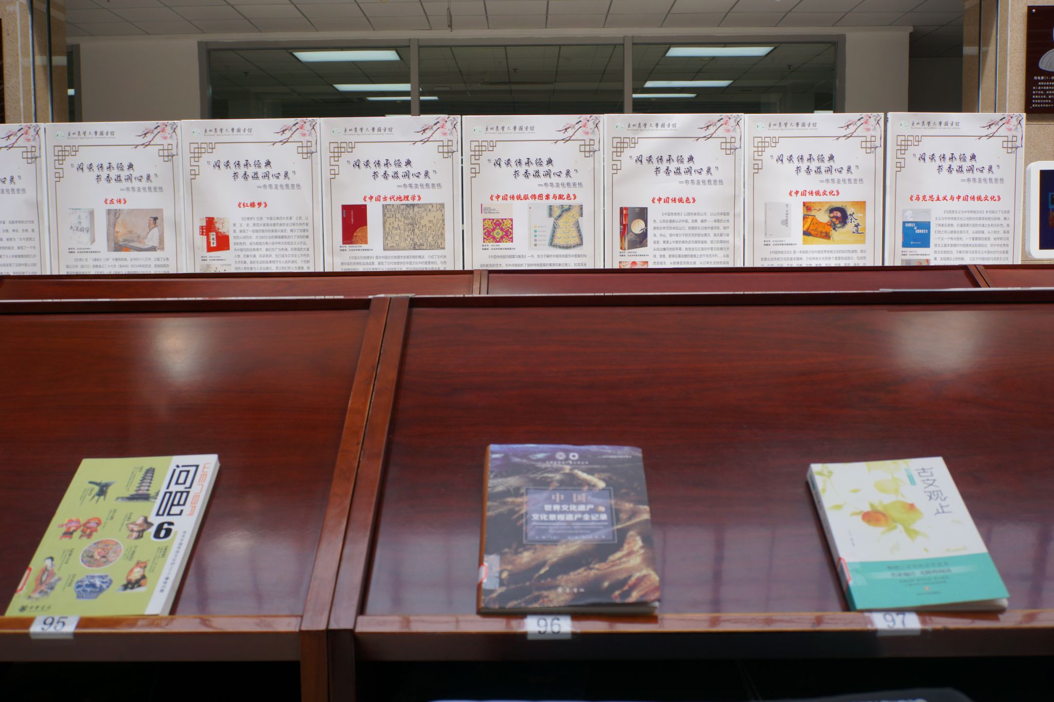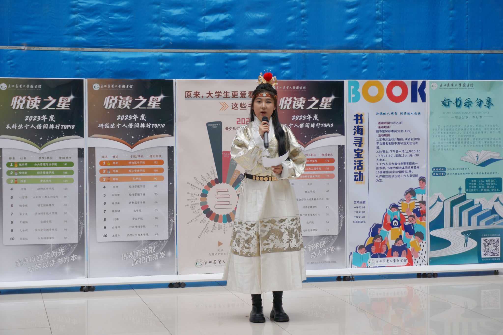在精彩展示部分,通过现场展架和公众号推送的方式,公布了2023年度东北农业大学图书馆相关数据统计报告,向读者展示了借阅量位列前10名的教工、研究生、本科生等“悦读之星”。以推介传统文化经典书籍为指向的“阅读传承经典,书香滋润心灵”中华文化我宣扬活动,通过展板与实物,为大家推荐经典好书,于书中启迪智慧,于书中传递思想,以彰显古典书籍的魅力和传统文化的源远流长。