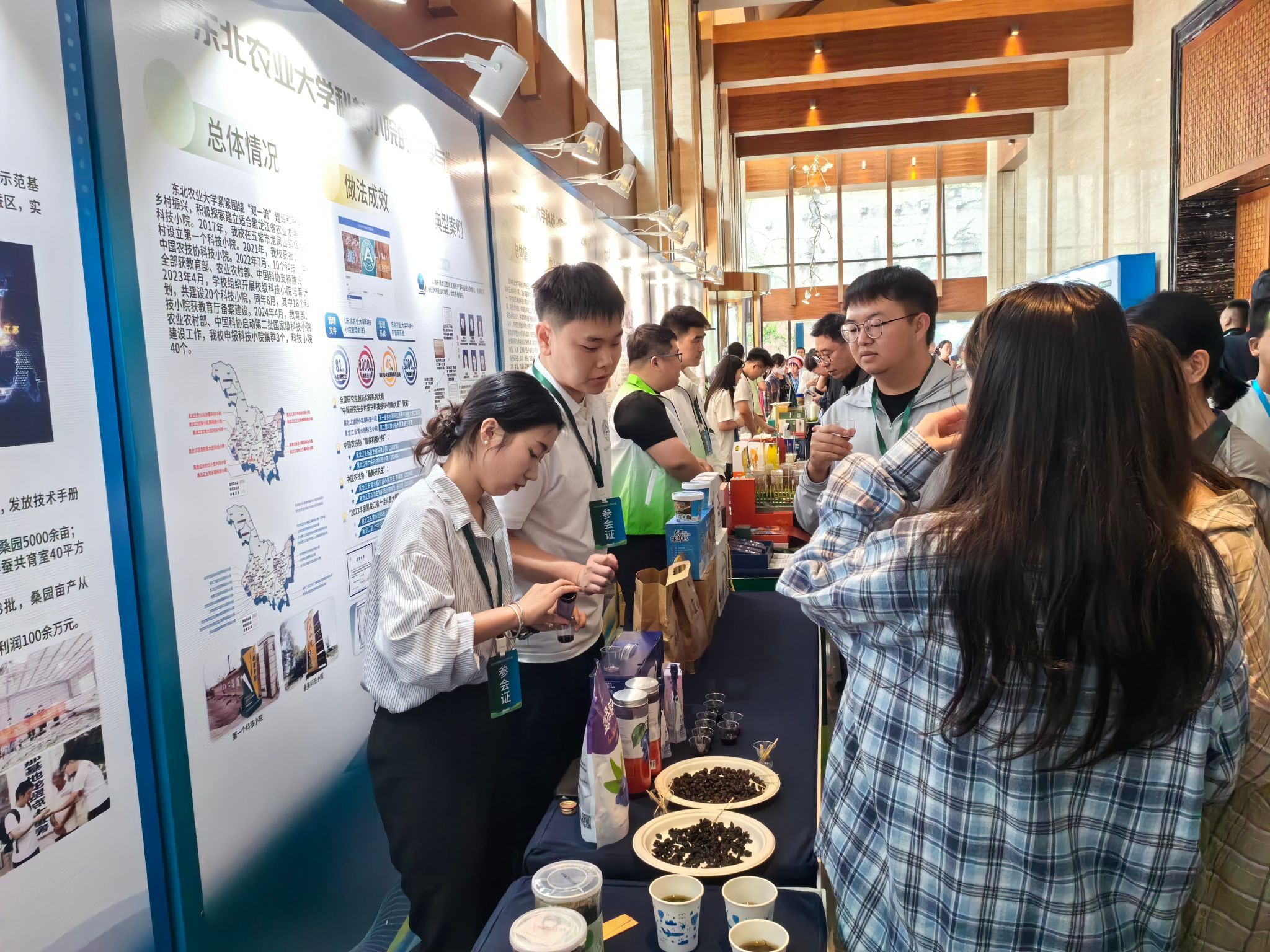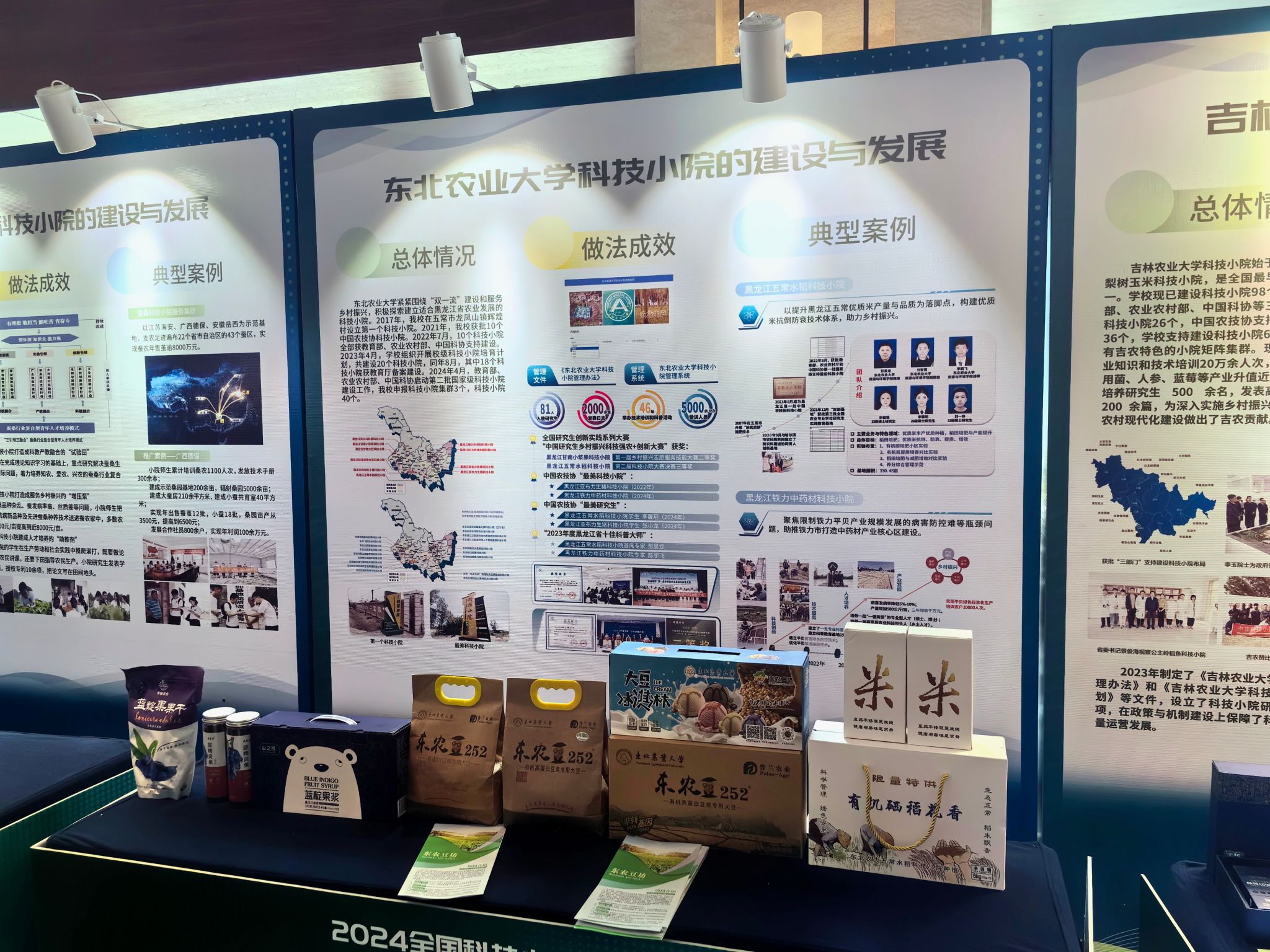 会议期间,还举办了科技小院成果展,来自全国各地38所高校、科研院所参展。学校在本次成果展上通过展板和实物展品集中展示了学校科技小院在人才培养、科技创新、社会服务等方面取得的重要成果,并重点推介了学校科技小院稻米产品、大豆制品和小浆果制品等成果。学校博士研究生殷鸿博、硕士研究生张贤在现场进行展品讲解。