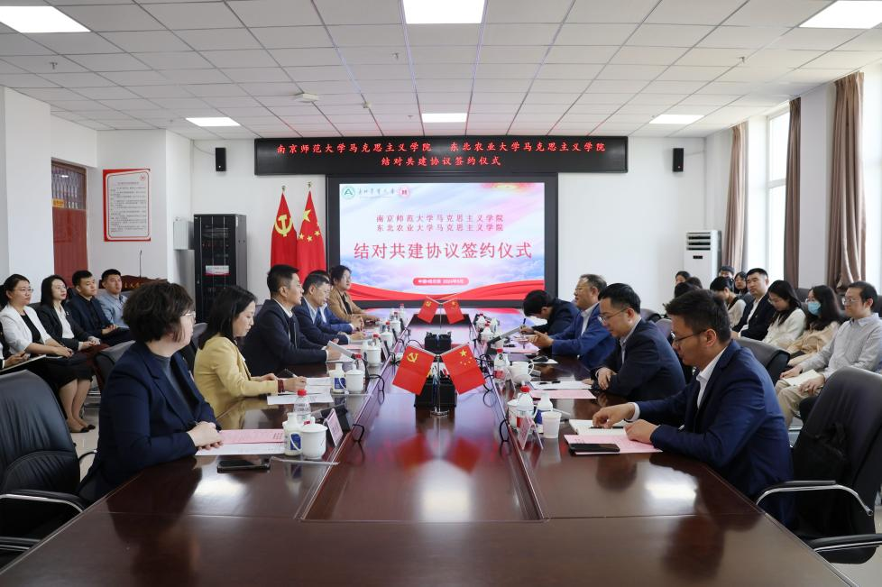 为全面贯彻落实中共中央办公厅《关于加强新时代马克思主义学院建设的意见》精神,充分发挥国家重点马克思主义学院示范引领作用,5月8日上午,马克思主义学院与南京师范大学马克思主义学院举办结对共建签约仪式。南京师范大学马克思主义学院院长王刚、副院长洪光东等人出席会议,东北农业大学党委副书记贺景平、马克思主义学院党委书记吕晶、院长许静波、副院长刘大勇、赵继颖等人参加会议,会议由许静波主持。