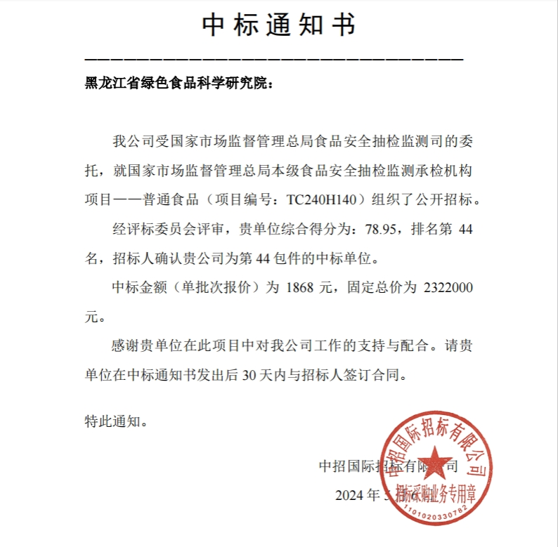 5月6日,中国政府采购网发布了“国家市场监督管理总局2024年本级食品安全抽检监测承检机构项目—普通食品中标公告”,黑龙江省绿色食品科学研究院投标项目成功中标,时隔两年以后重新回到国家市场监管系统“检验检测国家队”,成为同时跻身农业农村部生鲜乳质量安全监管领域和国家市场监管总局食品安全抽检领域的检验检测机构。