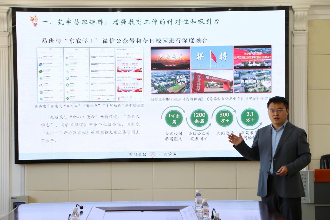 朱明伦对东北农业大学易班建设与大学生网络思政工作取得的成绩表示充分的肯定,介绍了教育部易班建设的背景并解读教育部对做好网络思政工作的相关要求。他强调,学校易班工作站建设要进一步加强网络内容的创新,鼓励师生自主创作优质微电影、动漫、音乐等网络作品;要利用好“青梨派”等高校思政课资源平台,加强网络育人机制的建设;要不断开发和挖掘人工智能赋能思政工作案例,探索实现易班共建新路径。