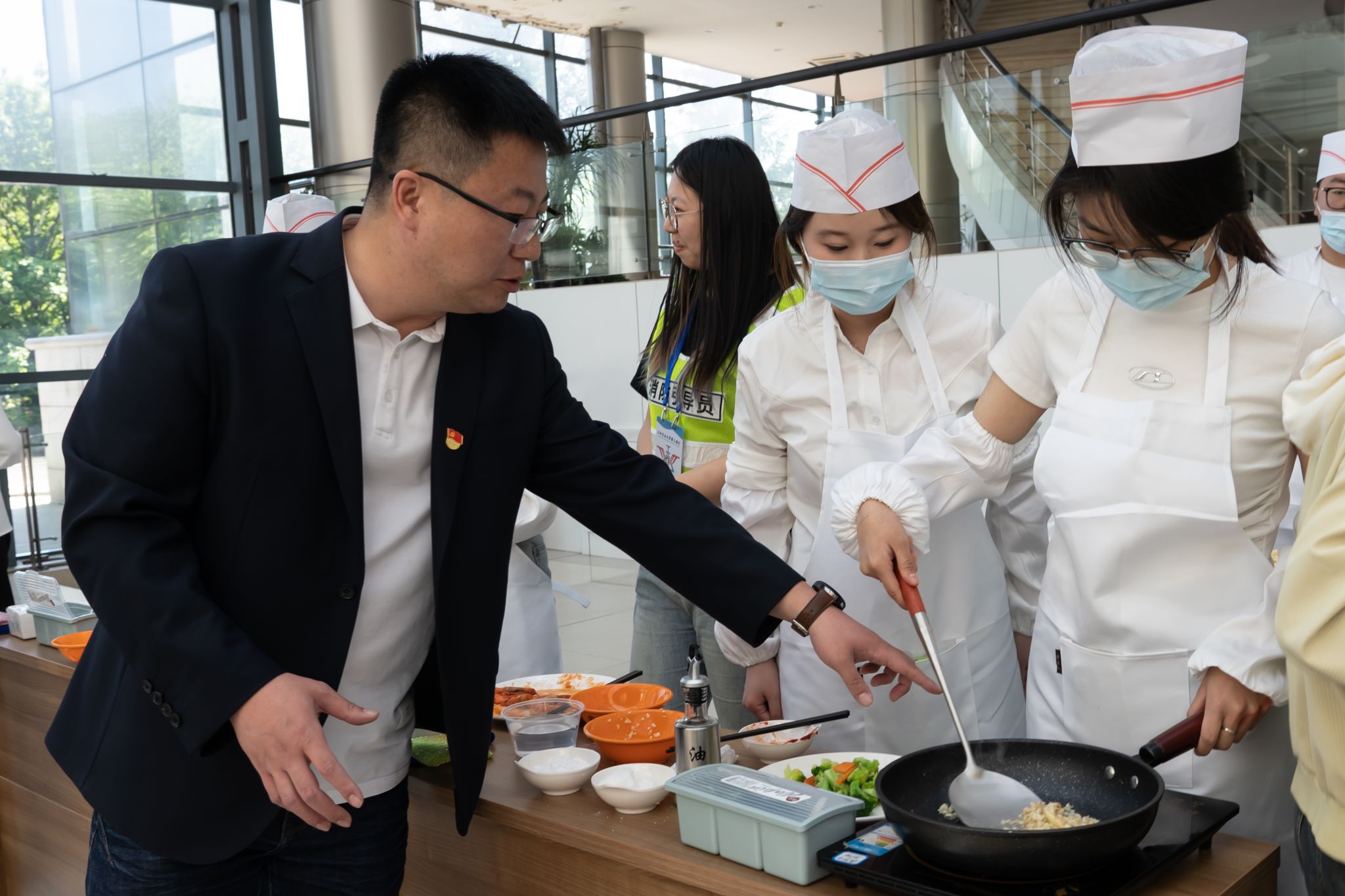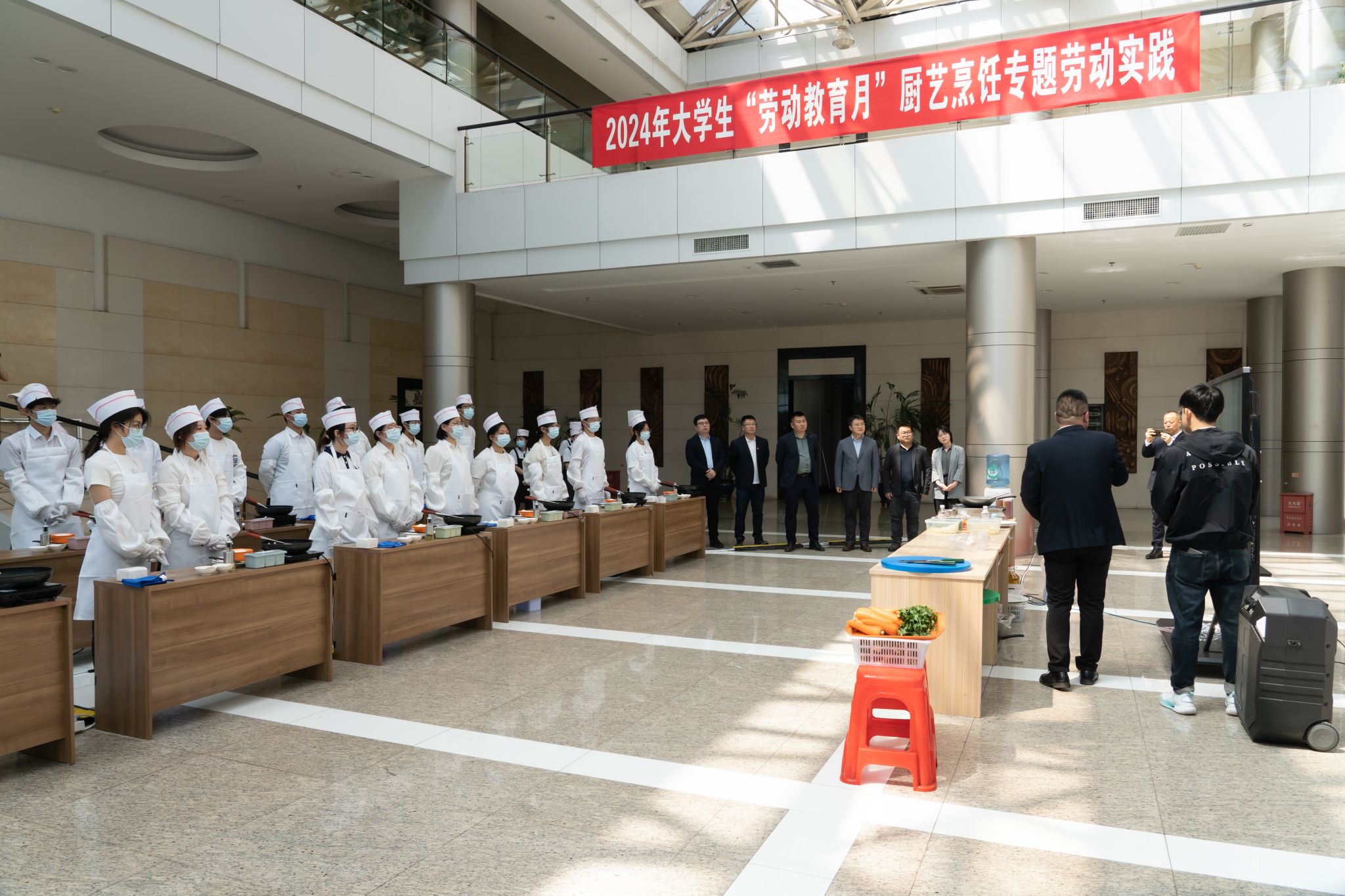 为进一步拓宽劳动教育实践载体,丰富劳动实践形式,提升学生劳动实践能力,培养健康饮食习惯,按照2024年大学生“劳动教育月”活动安排,5月16日,学生工作部联合后勤管理处,组织开展了厨艺烹饪劳动实践课。学生工作部部长于兴业、副部长刘双奇,后勤管理处副处长谭留兵、饮食服务中心主任王功臣到现场观摩授课。
