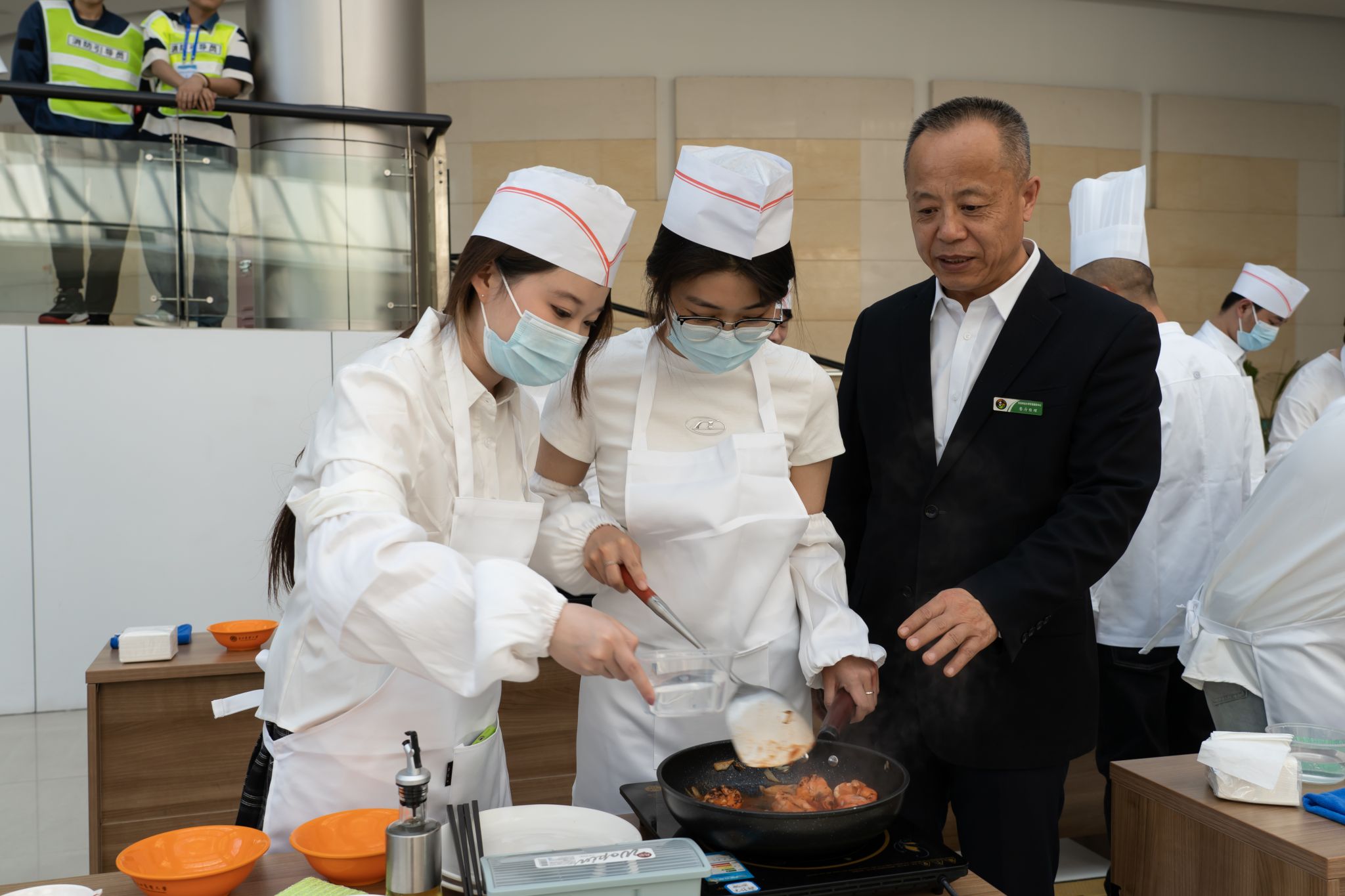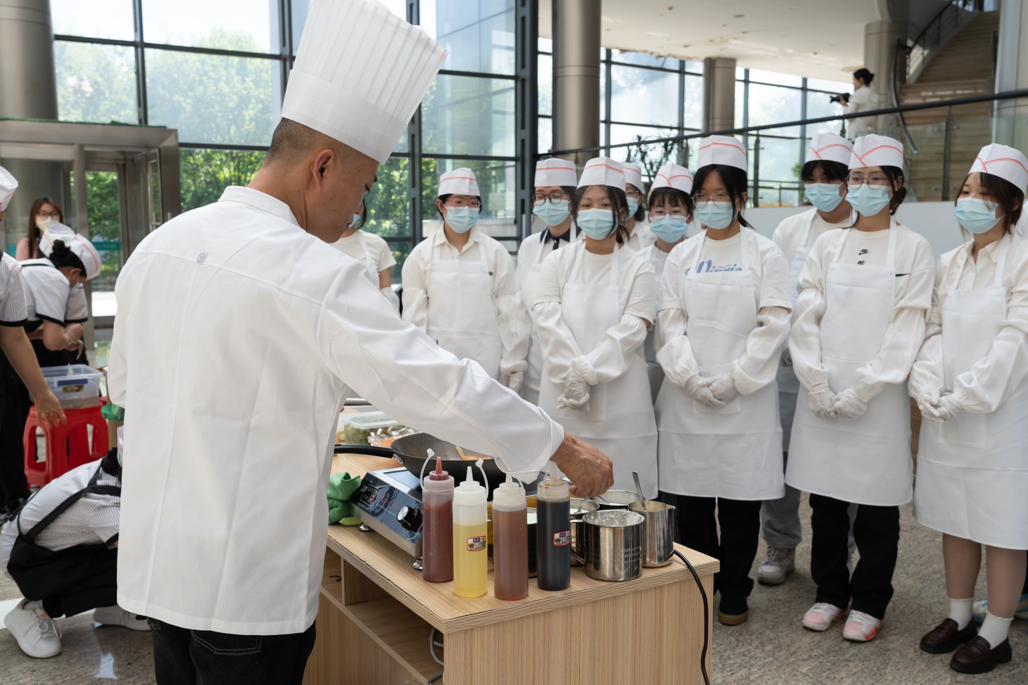 同学们聚精会神,认真学习烹饪技法,了解菜品制作特点,掌握操作技能,不时为厨师的精湛技艺发出赞叹。