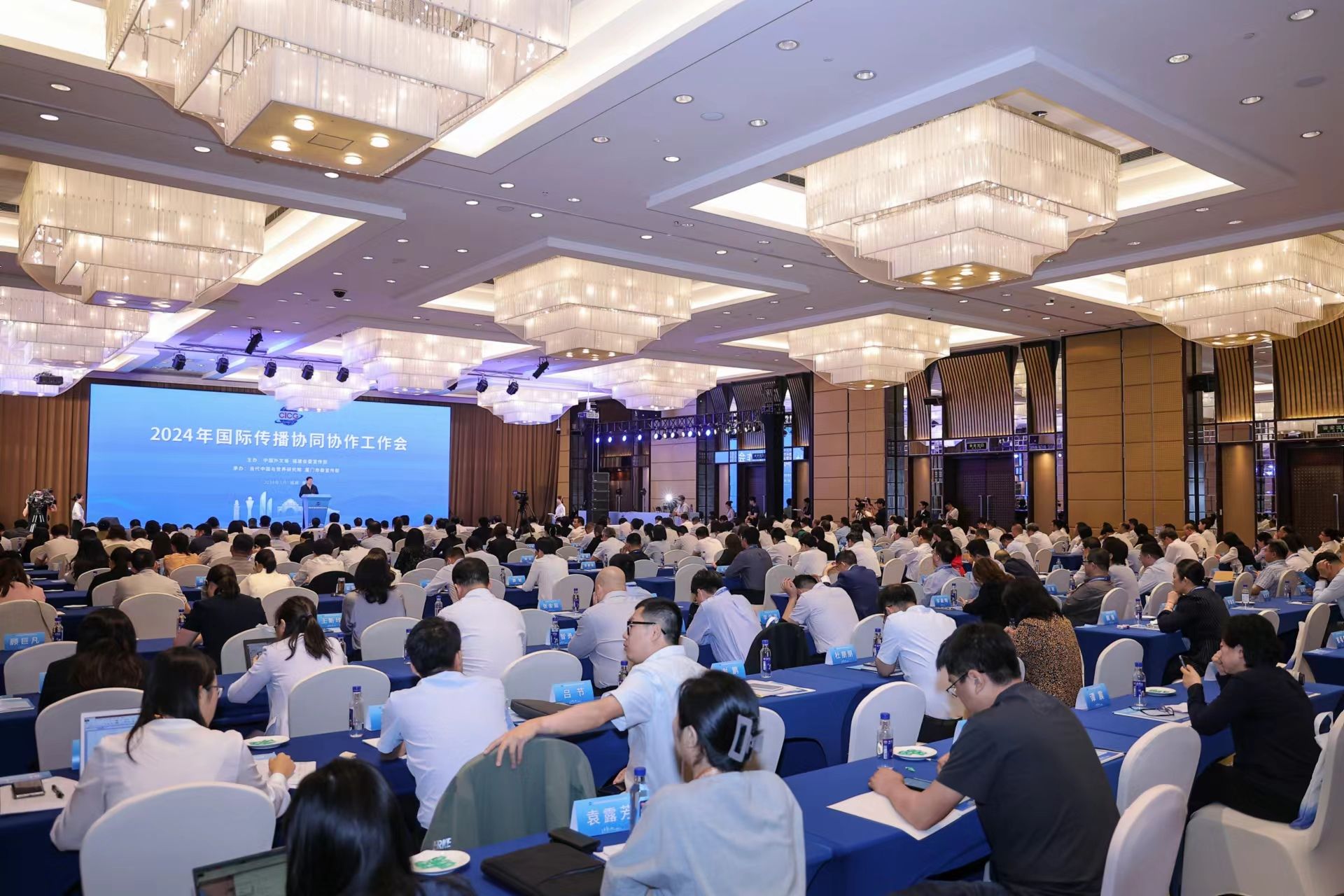 5月31日,由中国外文局、中共福建省委宣传部主办,当代中国与世界研究院、中共厦门市委宣传部承办的2024年国际传播协同协作工作会在厦门召开。中国外文局局长杜占元,中共福建省委常委、宣传部部长张彦,国务院新闻办公室原副主任、中国公共关系协会会长郭卫民,中国外文局副局长于运全,中国外文局副总编辑陈实,中宣部国际传播局副局长兰斌,中共厦门市委常委、宣传部部长吴子东等出席会议。来自中央和国家机关,全国25个省、自治区、直辖市,部分计划单列市、特邀城市,福建省内各地级市宣传部门负责同志,中国人民大学等高校及智库研究机构、有关企业负责同志,中国外文局所属单位、机关部室负责同志等260余人参加会议,学校党委副书记贺景平、宣传部部长吴春丽、国际交流合作处副处长孙晔参加会议,开幕式由于运全主持。
