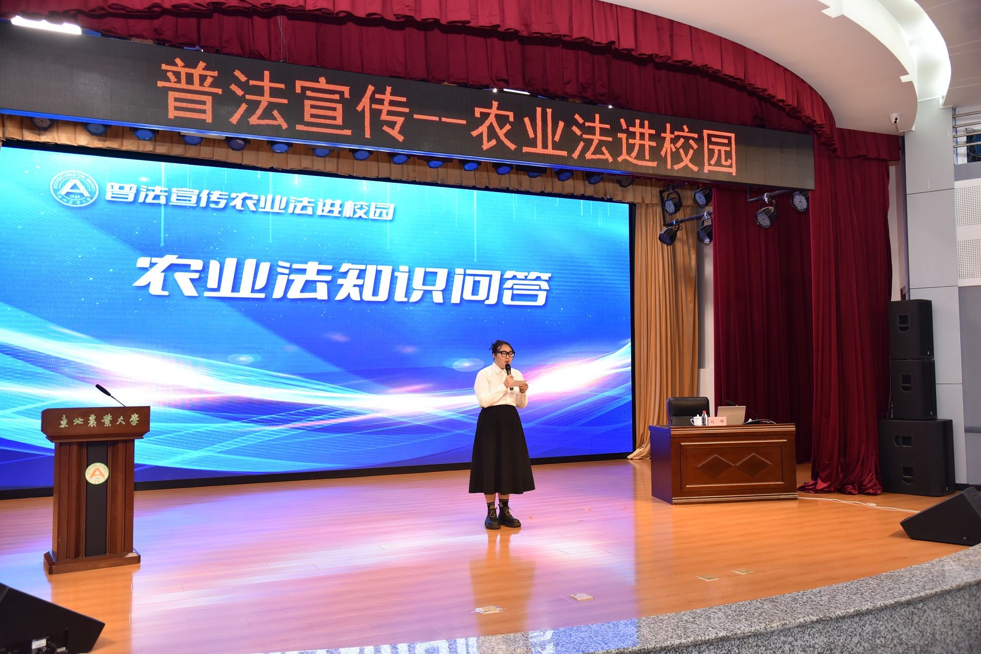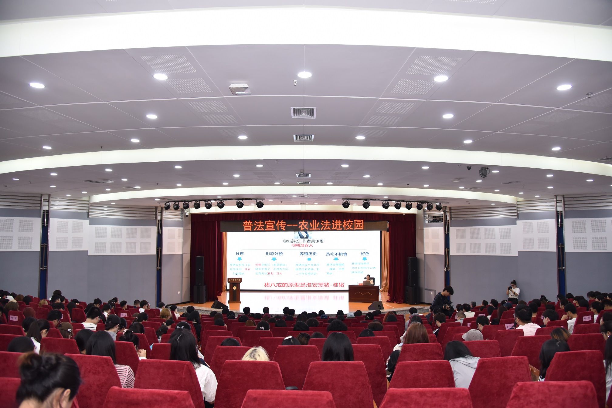 刘娣进行农业法普法授课。刘娣立足自身的专业优势,从东北农业大学学情出发,以《猪八戒和他的兄弟们》为主题,围绕中国养猪历史与文化、中国猪种资源的优良特性、猪种资源保护利用相关法律法规为现场师生进行了专题授课。