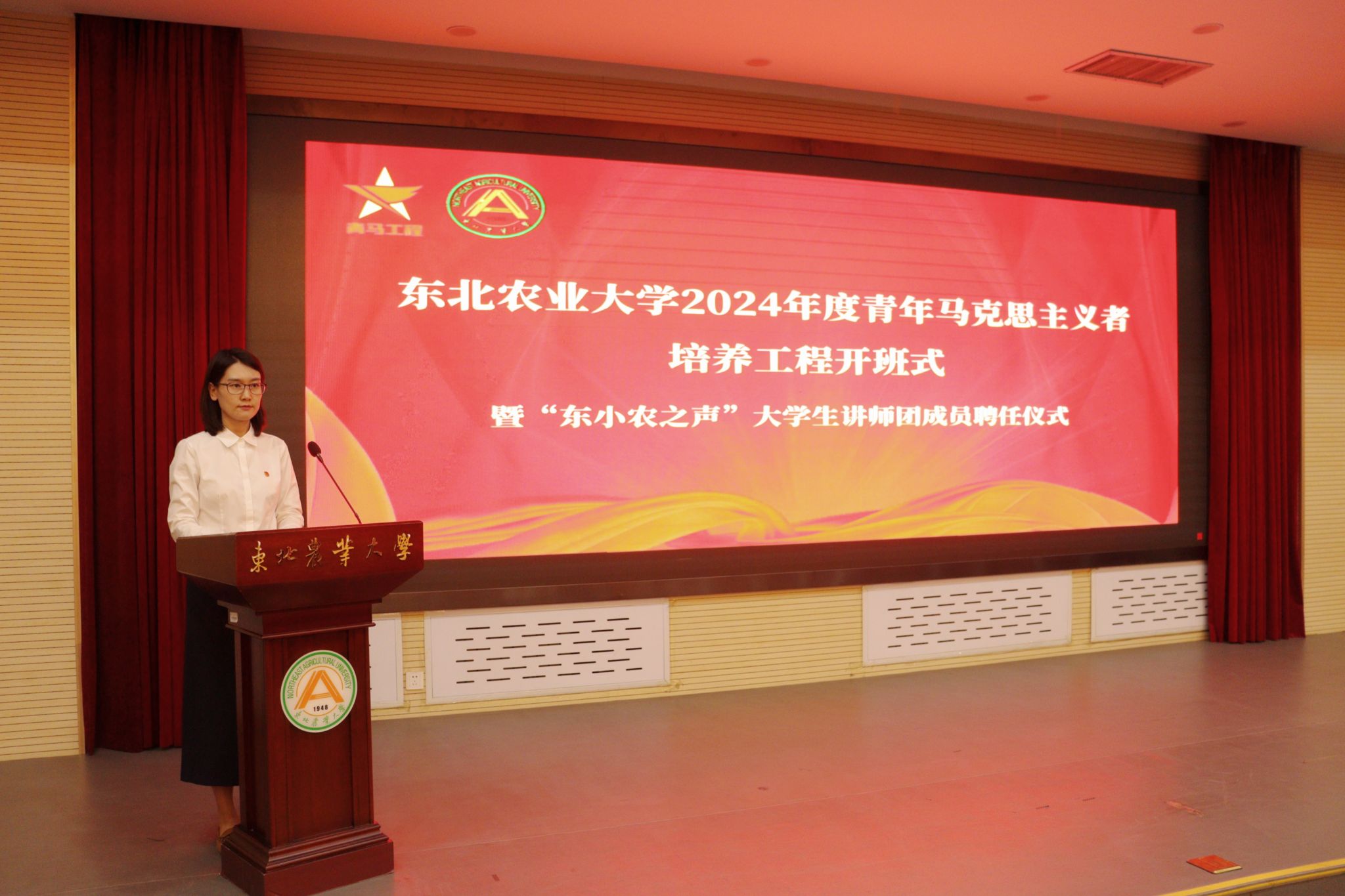 为深入学习宣传贯彻习近平总书记五四青年节对全国广大青年寄语精神,纵深推进学校青年马克思主义者培养工程走深走实,6月11日,2024年度东北农业大学青年马克思主义者培养工程开班式在国际学院报告厅举行。校团委书记李卡、校团委副书记焦文静,各学院团委负责人,全校200余名青马工程学员参加开班仪式。培训班邀请中共黑龙江省委党校马克思主义学院院长陈晨教授为校青马学员作第一讲专题辅导。开班式由校团委组织建设科科长魏天赋主持。
