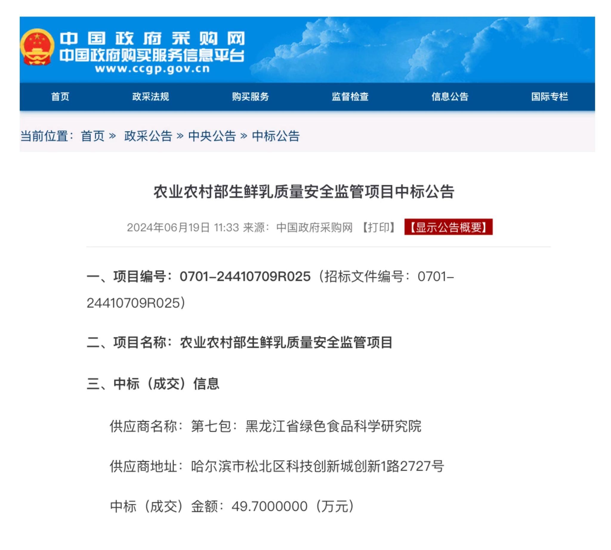 6月19日,中国政府采购网发布了“农业农村部生鲜乳质量安全监管项目中标公告”,绿研院再次成功中标该项目。