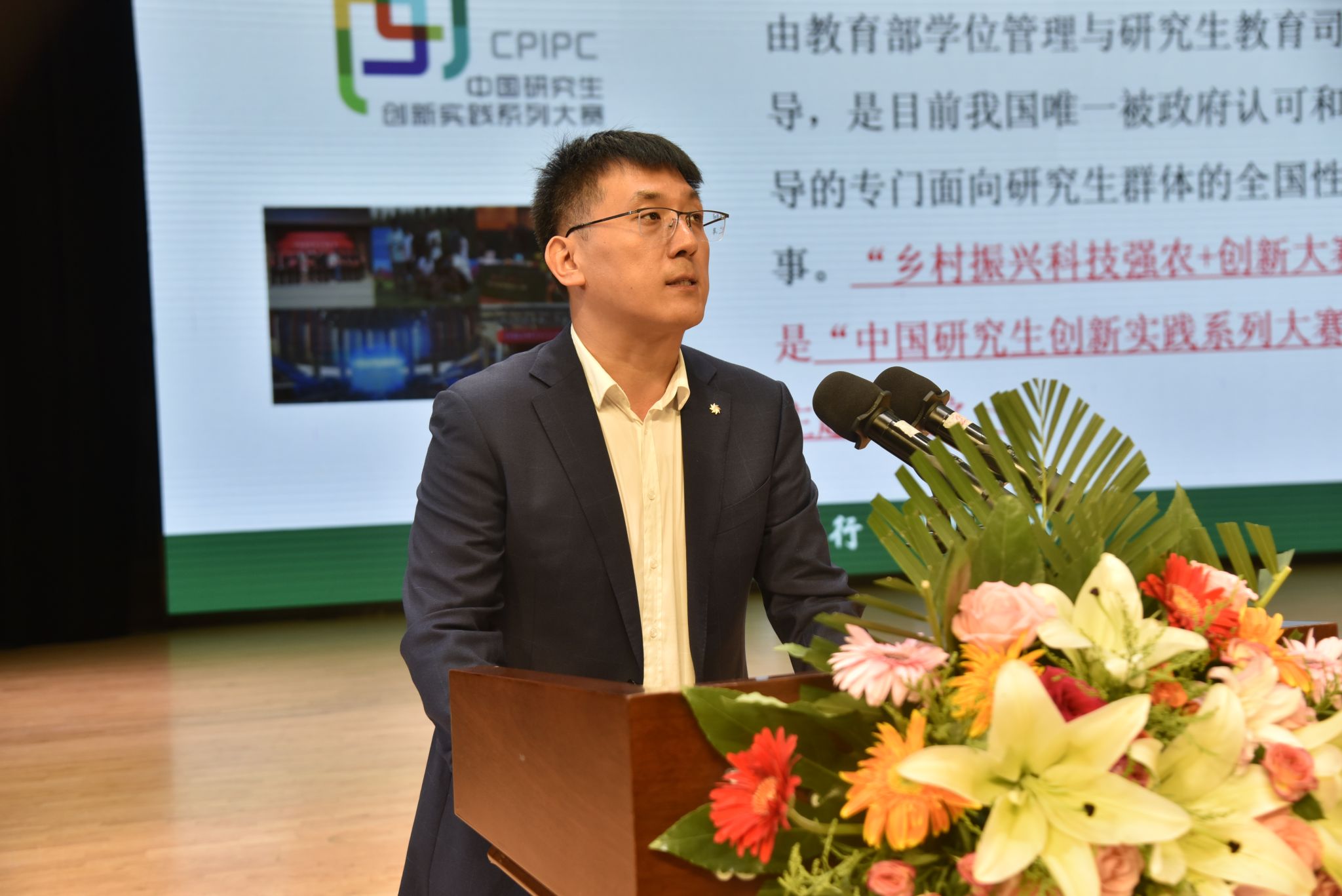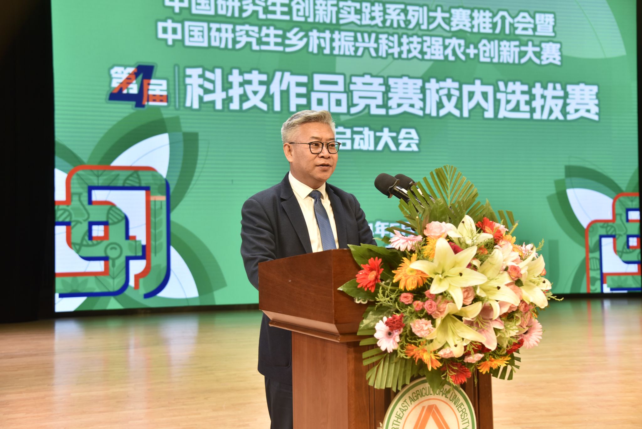 付强代表学校向参会领导和嘉宾表示欢迎,向关注和支持学校各项事业发展的各界朋友表示感谢,向躬耕在研究生教育和学生工作一线的同志表达崇高敬意,向追求卓越、勇于创新、勤于实践的研究生表示赞扬。他指出,中国研究生创新实践系列大赛是目前我国唯一被政府认可和指导的专门面向研究生群体的全国性赛事,自2013年开赛以来,已经成为提高研究生培养质量、推动研究生创新创业教育改革的有力抓手和优秀平台,积极参与大赛是顺应研究生教育改革与发展趋势,也是服务国家战略、社会发展、地方经济和产业创新的重要举措。他表示,乡村振兴关系社会主义现代化国家建设全局,推动乡村全面振兴已被写入今年中央一号文件中,东北农业大学能够成为2024年中国研究生乡村振兴科技强农+创新大赛第四届科技作品竞赛承办单位,责任重大、使命光荣、意义非凡,这既是对全面推进乡村振兴和农业现代化的深度回应,也是深入探索培养更多知农爱农新型人才的实际行动。同时,他对大赛推介和竞赛承办工作提出几点要求,一是积极引导学生关注和参与系列大赛,着力培养研究生科研创新精神和实践能力;二是要严格执行竞赛组委会要求,加强部门协作,激发队伍活力,积累大赛实战经验;三是做好大赛宣传和推广工作,协同各方力量,营造良好竞赛氛围,提高赛事影响力,以优质服务创建东农竞赛品牌,展现龙江高校担当。