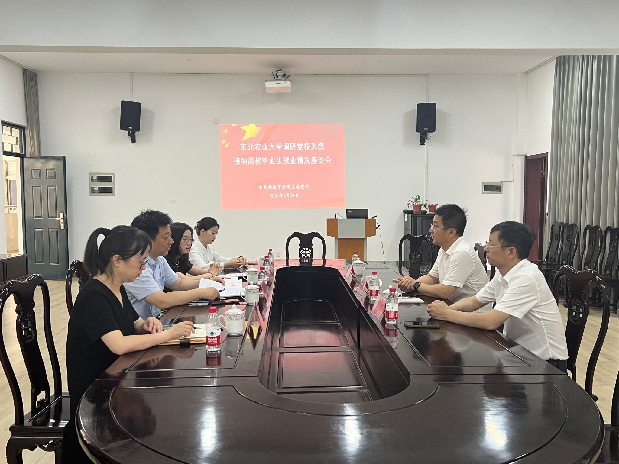 在江苏省南通市崇川区委党校,副校长缪建介绍了南通市崇川区委党校的基本情况,对录用高校毕业生标准、需求总量、需求偏好及自主招考方式等方面进行了详细解读。贺景平介绍了东北农业大学发展历史、发展现状、人才培养特色及毕业生就业情况,他表示,党校教师现已成为马院学生就业的重要选择之一,党校将成为学生实现高质量就业的重要渠道。双方围绕人才在区域发展中的重要作用、毕业生就业偏好、用人单位对毕业生知识、能力和素质的全方面要求等方面进行了深入探讨。