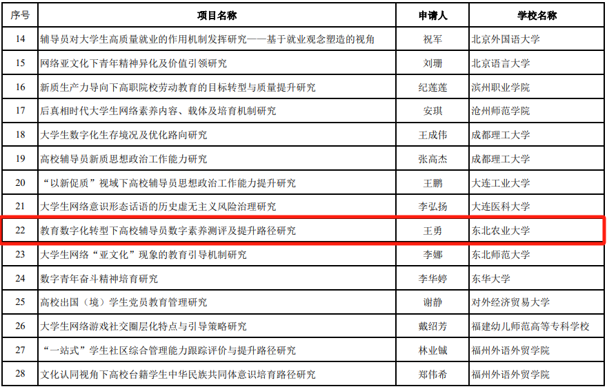 近日,教育部公示了“2024年度教育部人文社会科学研究一般项目”评审结果。东北农业大学园艺园林学院副处级辅导员王勇主持申报的项目《教育数字化转型下高校辅导员数字素养测评及提升路径研究》入选专项任务项目(高校辅导员研究),这是辅导员队伍继上一年度获得教育部高校辅导员研究专项后,连续两年入选该类项目。