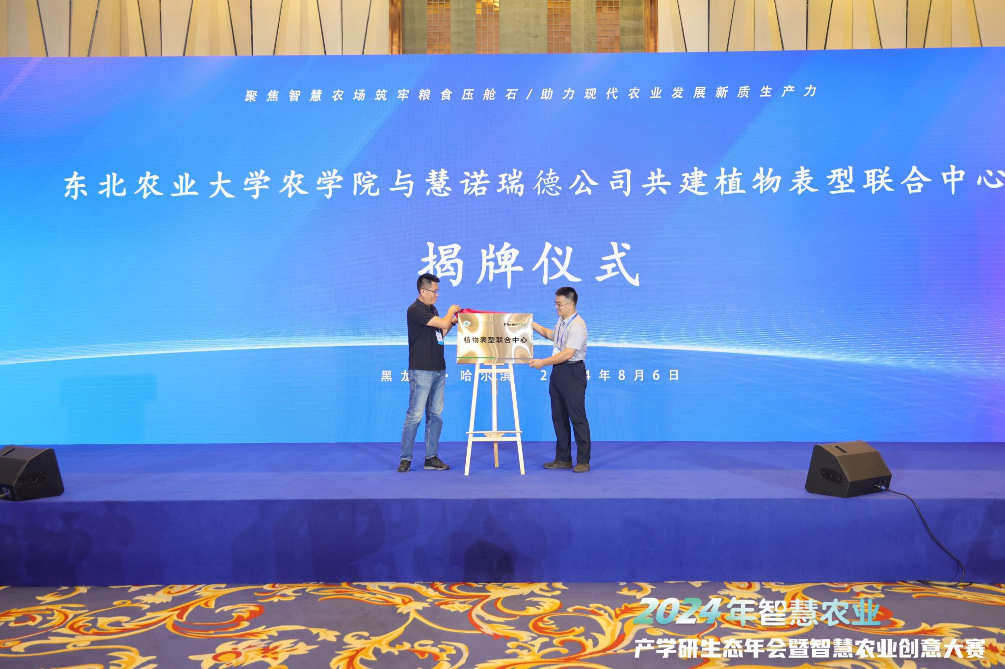 会上启动了东北农业大学农学院与瀚辰光翼科技有限公司共建智慧育种联合中心揭牌仪式。成都瀚辰光翼科技有限责任公司创始人、执行总裁张晗博士与辛大伟共同揭牌。