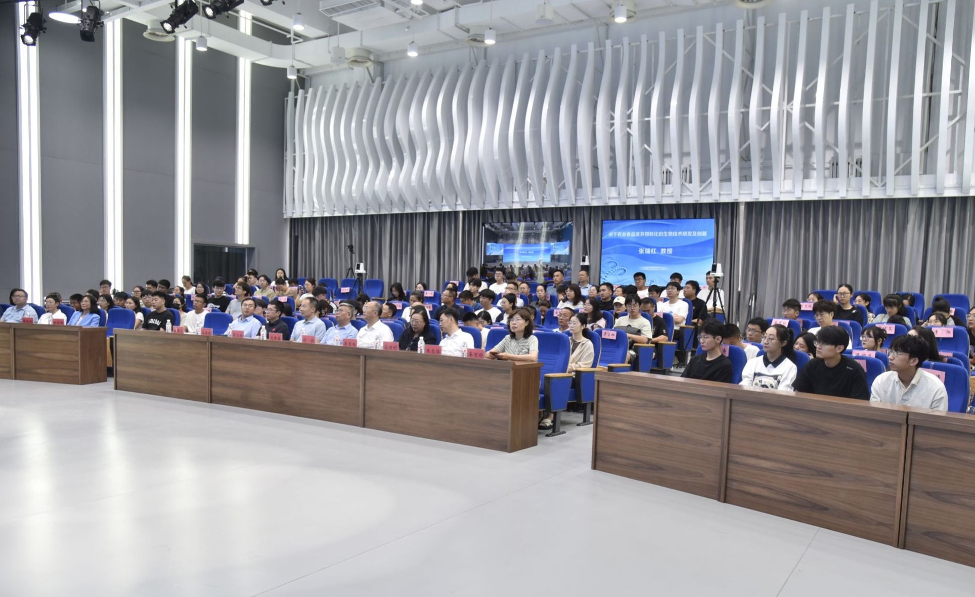 张瑞红教授以《用于农业食品废弃物转化的生物技术研发及创新》为题为现场师生作了生动、精彩的报告。报告围绕食品、材料和发酵与相关领域的需求及研究热点和发展方向进行介绍和探讨。报告中,张瑞红教授结合她所带领的团队在相关领域取得的成果和进展,分享了农业食品废弃物以及转化的生物技术研发和创新中的思考和建议。现场,张瑞红教授与师生在食品废弃物转化等方面进行了深入交流,随后,学生代表向张瑞红教授献花。