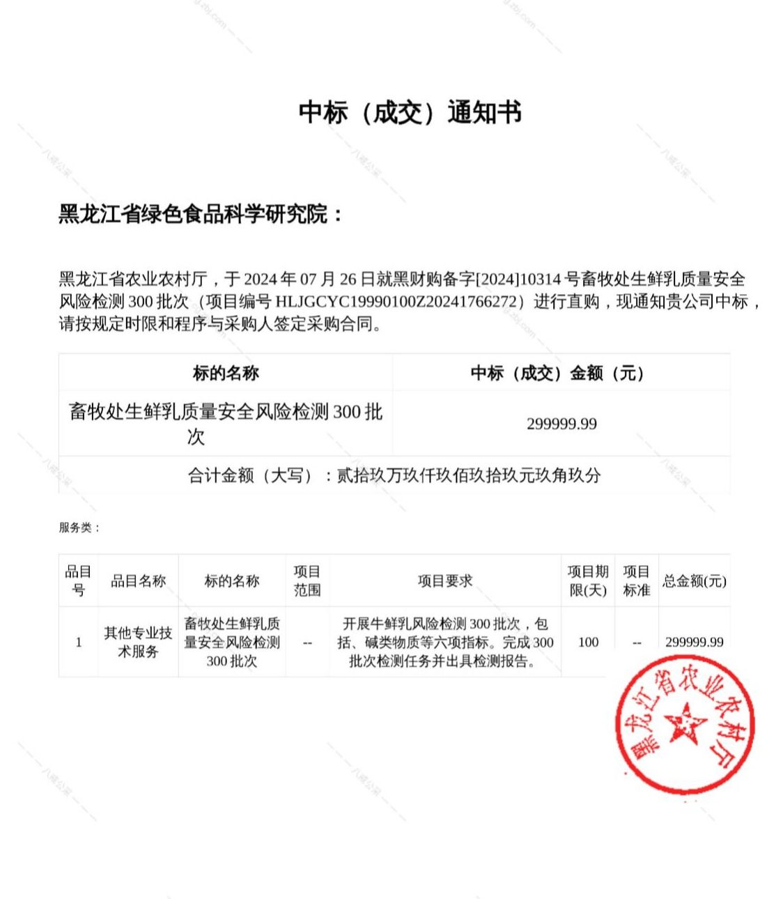 近日,省农业农村厅通过黑龙江省政府采购采购平台,发布“畜牧处生鲜乳质量安全风险检测”项目中标公告,黑龙江省绿色食品科学研究院通过直接采购方式中标。
