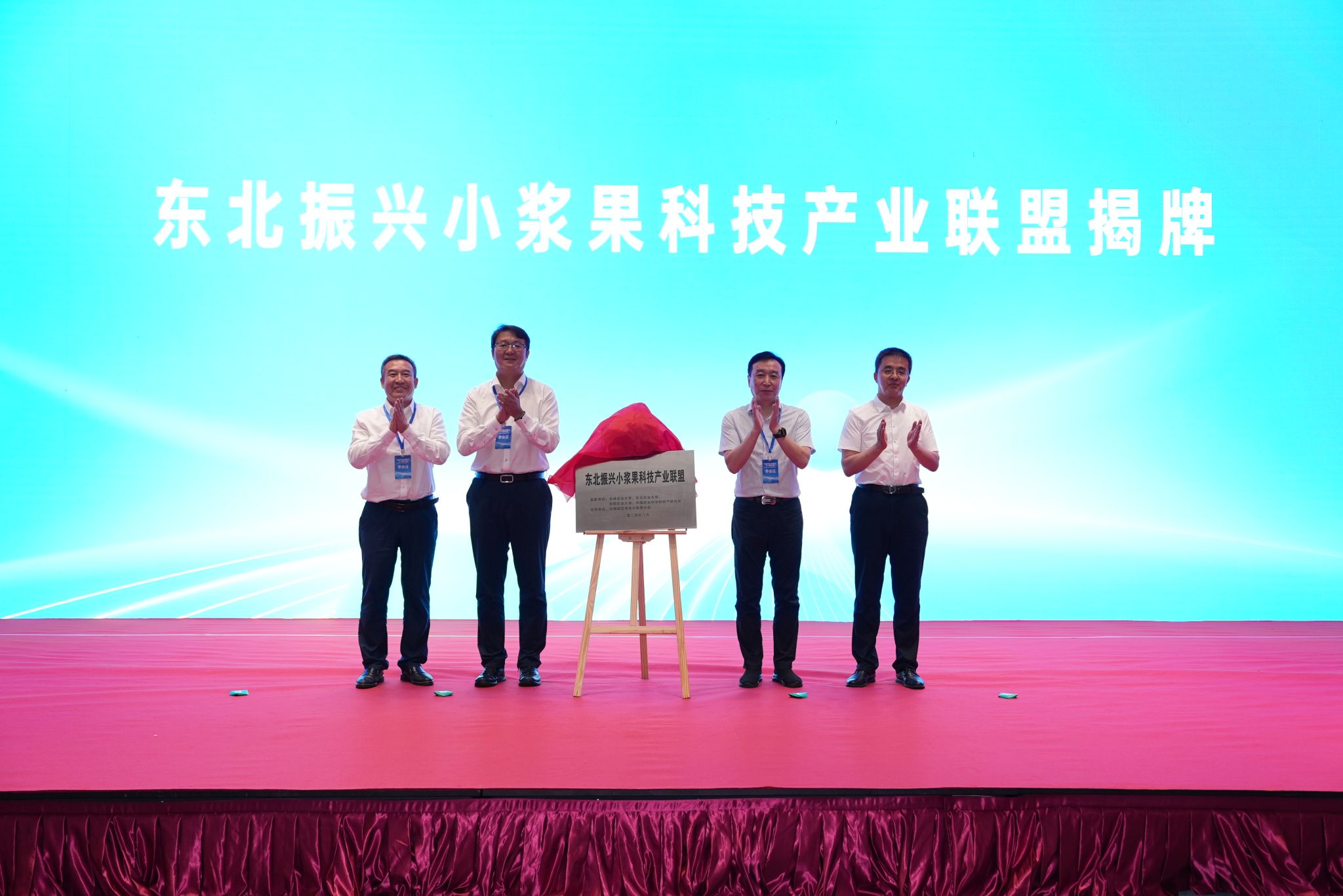 由吉林农业大学、东北农业大学、沈阳农业大学、中国农业科学院特产研究所共同发起的“东北振兴小浆果科技产业联盟”成立并在会议上举行揭牌仪式,吉林农业大学校长杜锐,沈阳农业大学党委副书记、副校长李斌、东北农业大学副校长刘竹青、中国农业科学院特产研究所副所长刘志杰共同为东北振兴小浆果科技产业联盟揭牌。