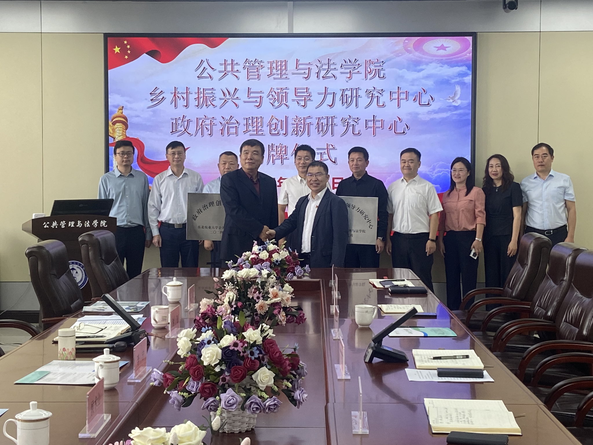 9月11日,东北农业大学公共管理与法学院新时代乡村振兴与领导力研究中心和政府治理创新研究中心成立揭牌仪式在成栋楼1106会议室举行。中央党校中国领导科学杂志社原美术总编辑、北京渔阳书院院长谢飞等3人受邀参加揭牌仪式。东北农业大学党委副书记贺景平、科学技术处副处长康立功及公共管理与法学院全体领导班子参加仪式。仪式由公共管理与法学院院长杜国明主持。