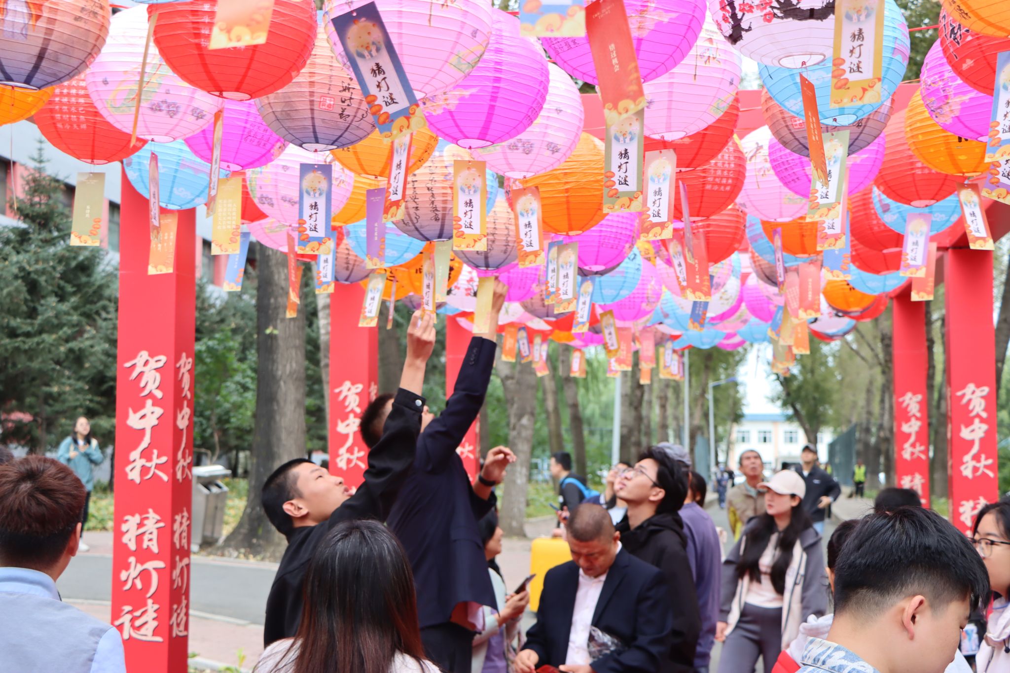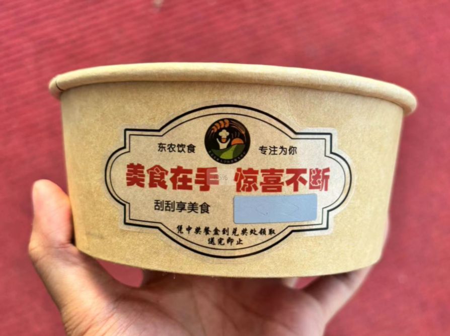 文化互动环节同样丰富多彩,主舞台一侧的“庆中秋,猜灯谜”互动区让师生在欢乐中加深了对传统文化的理解。此外,餐盒上的“刮刮乐”贴纸为活动增添了趣味性,奖品包括东农专属纪念小熊玩偶藤椒鸡腿、冰芒果、月饼等,活动现场气氛热烈。