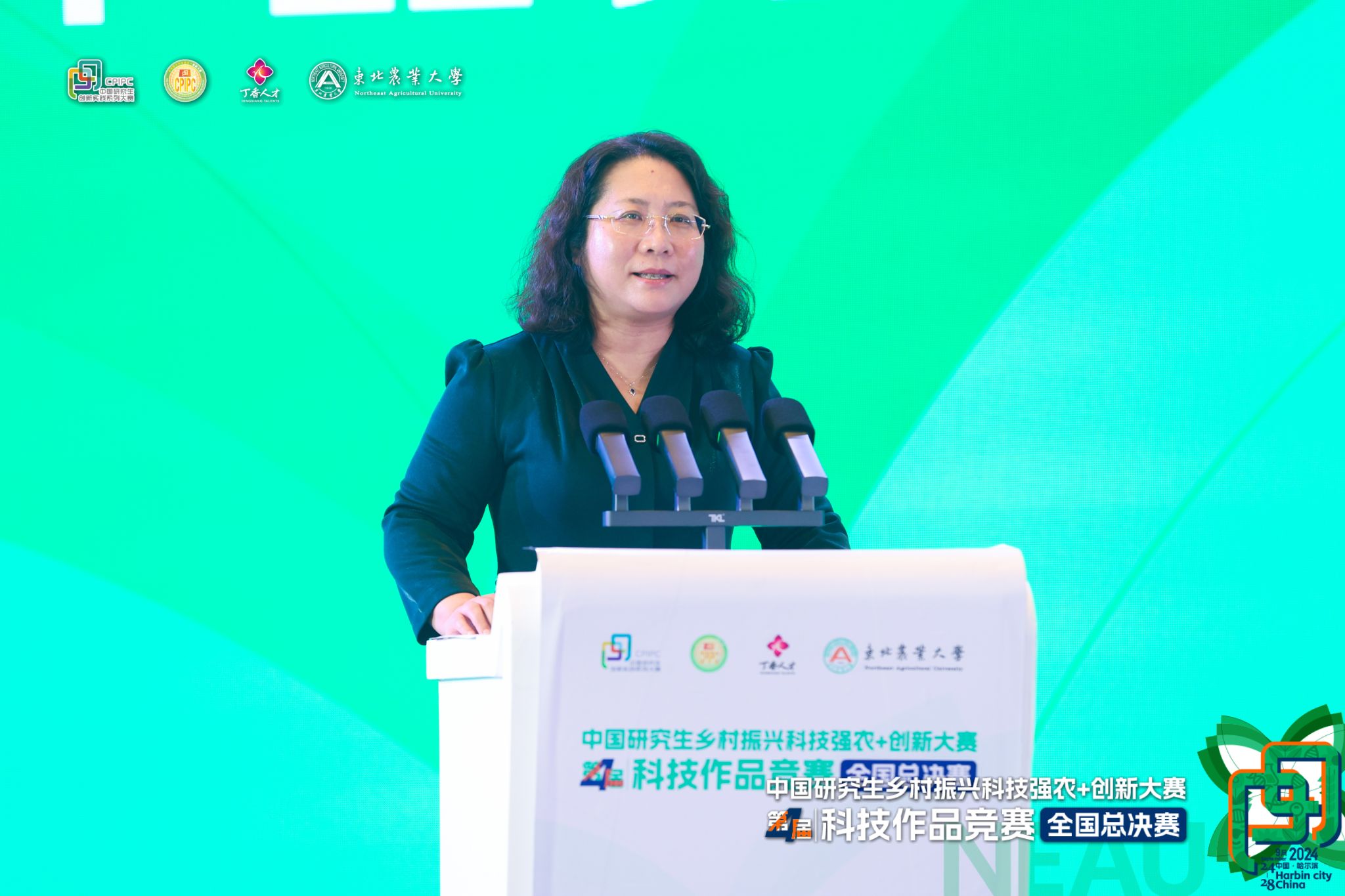 郭鑫在致辞中代表组委会对承办单位东北农业大学整体赛事组织工作给予了高度赞扬和充分肯定,对哈尔滨市委组织部人才办公室对比赛的鼎力支持表示感谢,向全体评审组专家表示敬意,并对包括俄罗斯国家参赛队伍在内的所有获奖团体和个人表示祝贺。她指出,政府和高校能够秉承“以赛促科技创新、以赛促人才培养、以赛促成果转化”的原则,联合深入推进市校联合办公机制,共同为大赛创新扩宽思路,进一步丰富了比赛内涵。她强调,乡村振兴是新时代党的一项重大战略部署,关乎国家长治久安与民族复兴的宏伟蓝图。而乡村振兴科技强农+创新大赛近年来在全国各类高校中影响力不断提升,至今已有累计1.3万余名研究生参与,已经成为培养知农爱农新型人才的重要平台。同时她希望全体同学以未来时代建设生力军、主力军的姿态,继续在共同推进乡村振兴和农业农村现代化方面建功立业。