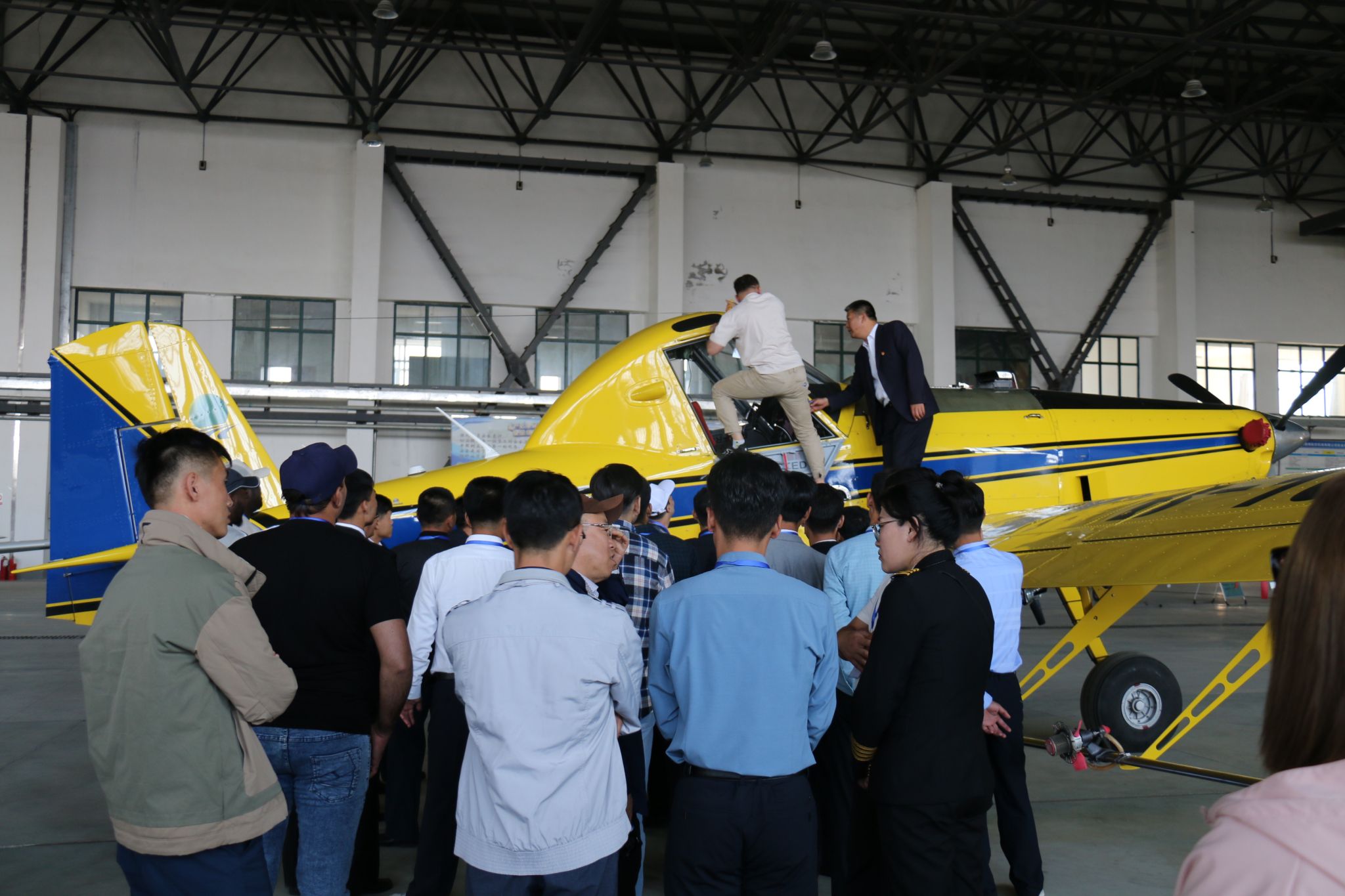 在北大荒通用航空有限公司,留学生们近距离感受到农业航空的知识。总经理孙辉介绍了北大荒航空的发展历史,农业航空与防灾减灾、森林巡航、森林防火、人工天气、增产增收等相关知识,并引导大家进入机库实地参观。