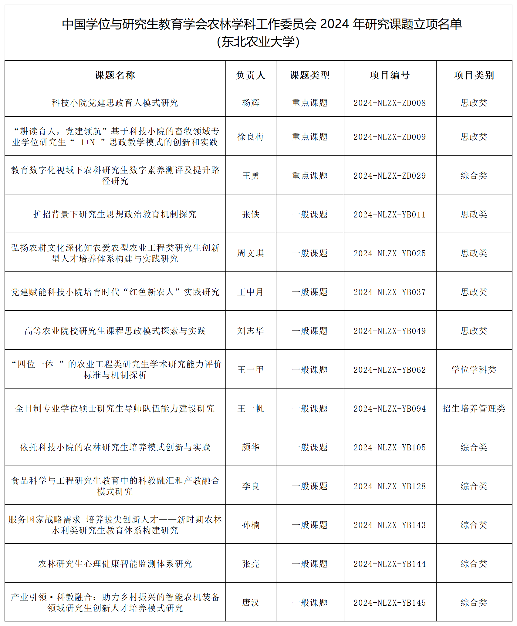 近日,中国学位与研究生教育学会农林学科工作委员会发布了2024年研究课题立项名单。全国共有188项课题获准立项,其中重点课题31项,一般课题157项。东北农业大学共申报研究课题22项,获准立项14项,其中重点课题3项(思政类2项、综合类1项),一般课题11项(思政类4项、学位学科类1项、招生培养管理类1项、综合类5项),获批立项总数取得重大突破,创历史新高,并位居全国农林高校前列。
