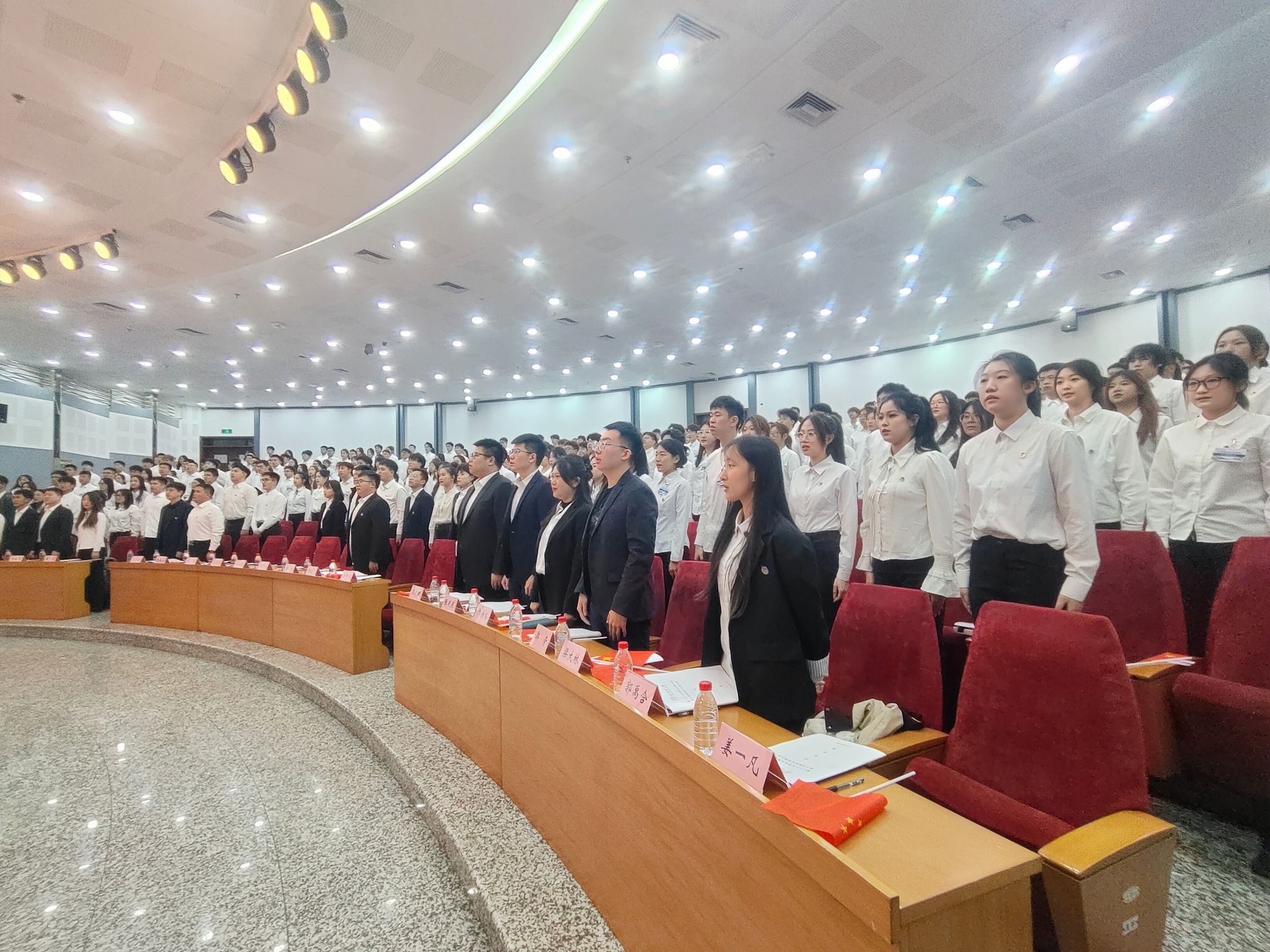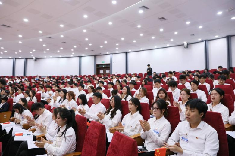 大会会场庄严肃穆,报告厅气氛热烈。晚6点,会议正式开始。全体起立,齐唱国歌。