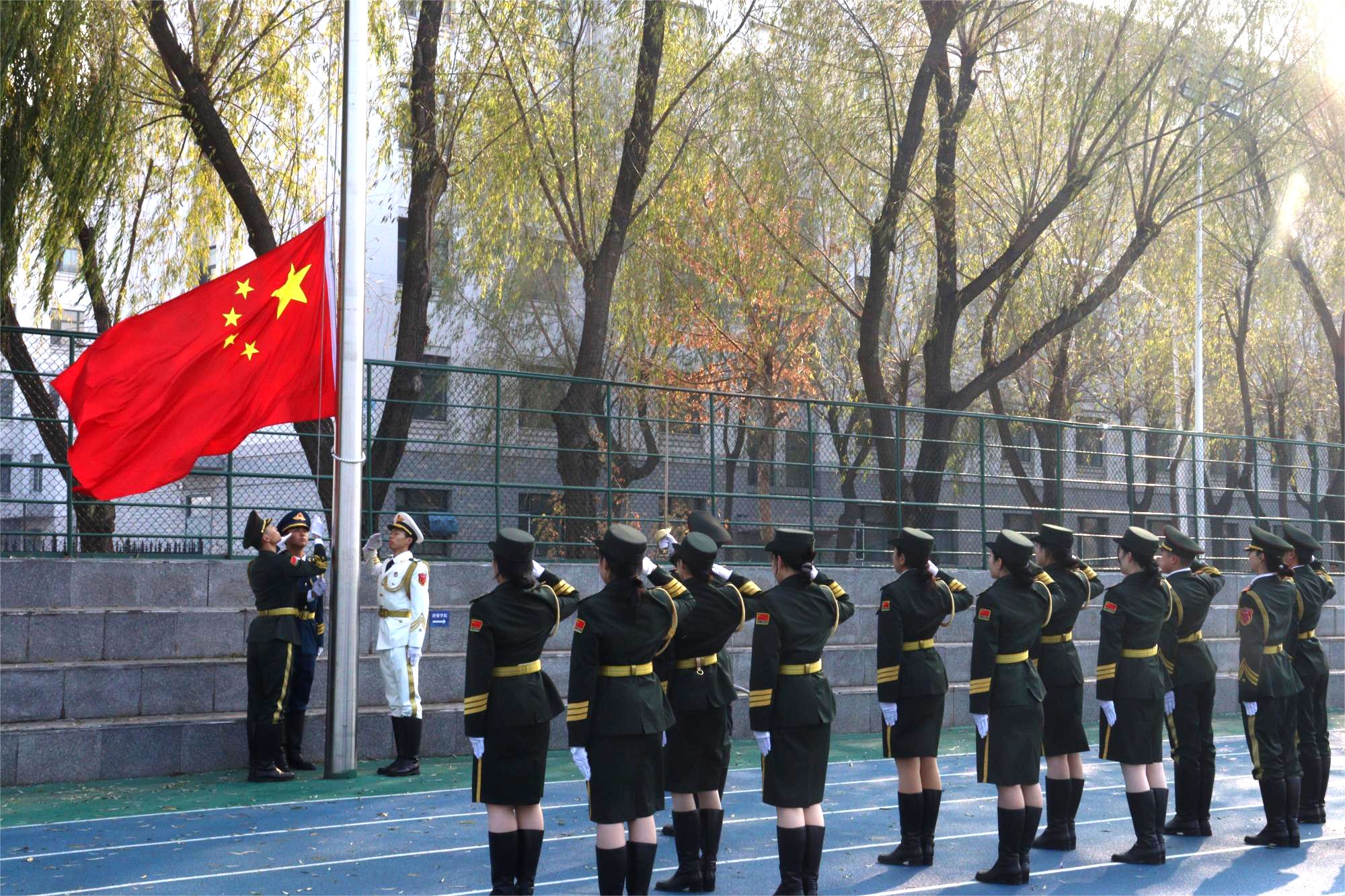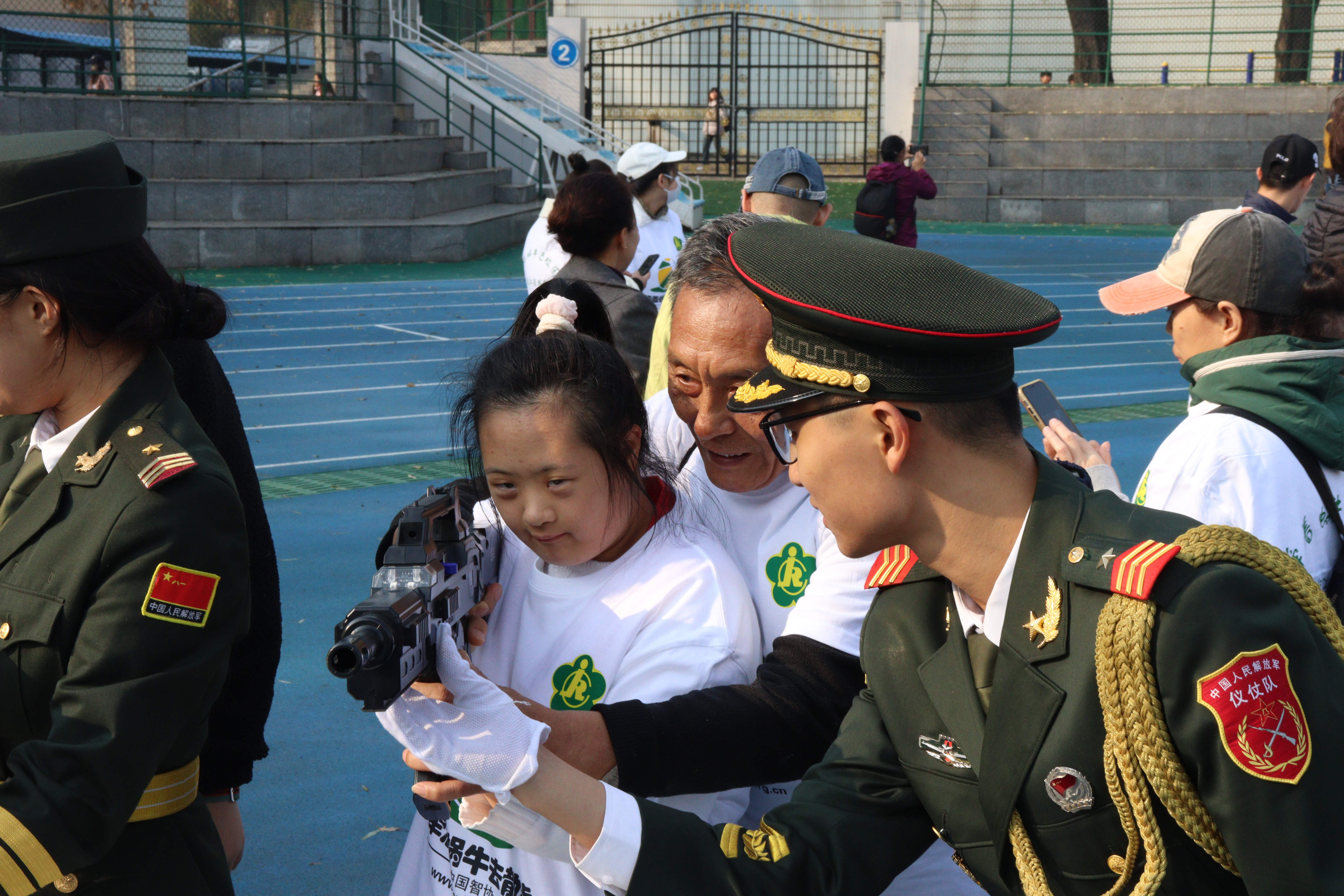 启动仪式后,“蜗牛”宝宝家庭在志愿者的陪同下于南区体育场观看升旗仪式。学校国旗护卫队自1999年成立起已参与25载志愿服务工作。活动现场,国旗护卫队为“蜗牛”宝宝这样一个特殊的群体展示了队列转换和操枪表演,提供了激光模拟射击体验。文韬武略、执笔携枪的东农青年与“蜗牛”宝宝共同体验了一次别开生面的爱国主义宣传教育,传递了“荣誉、责任、坚持、成长”的东农国旗护卫队精神,汇聚厚积起不断前行的澎湃力量。