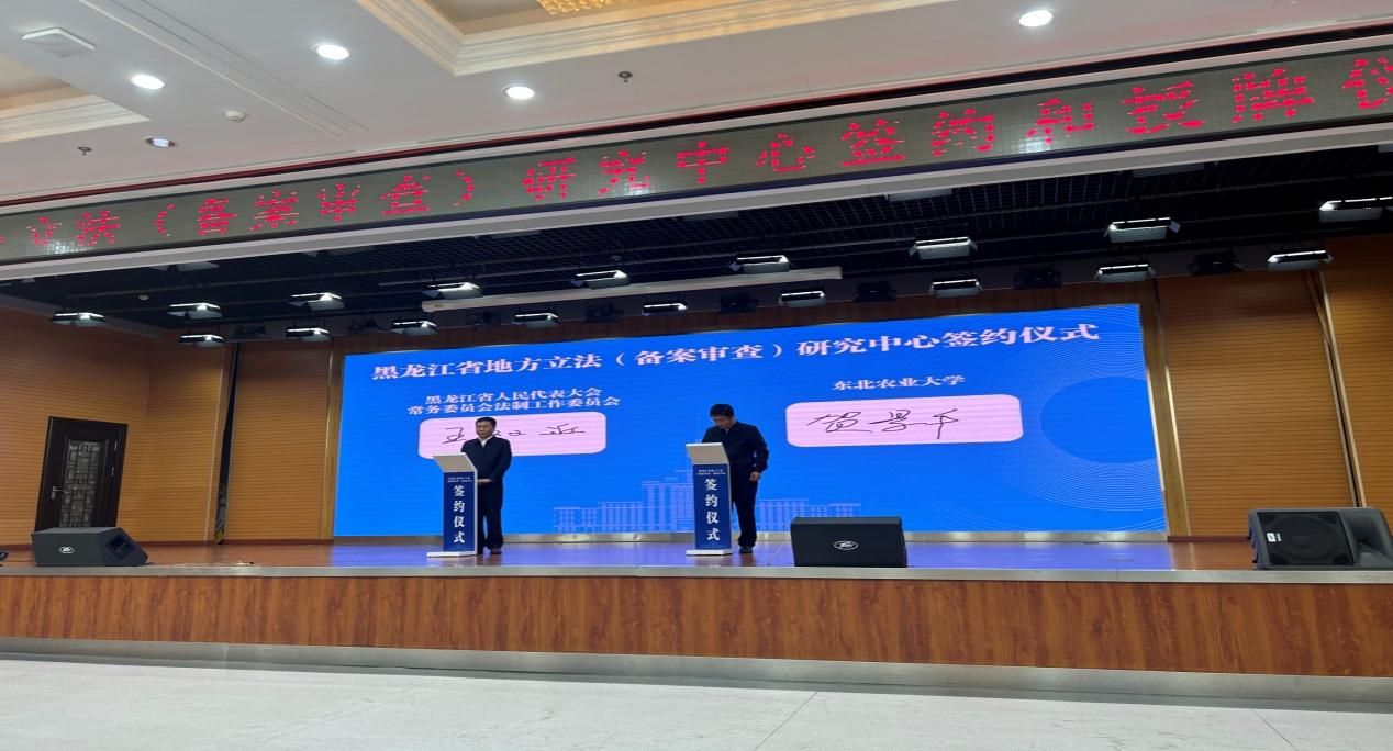 签约授牌仪式上,贺景平代表东北农业大学同省人大常委会法工委主任王双近签约,并接受省人大对我校地方立法(备案审查)研究中心的授牌。