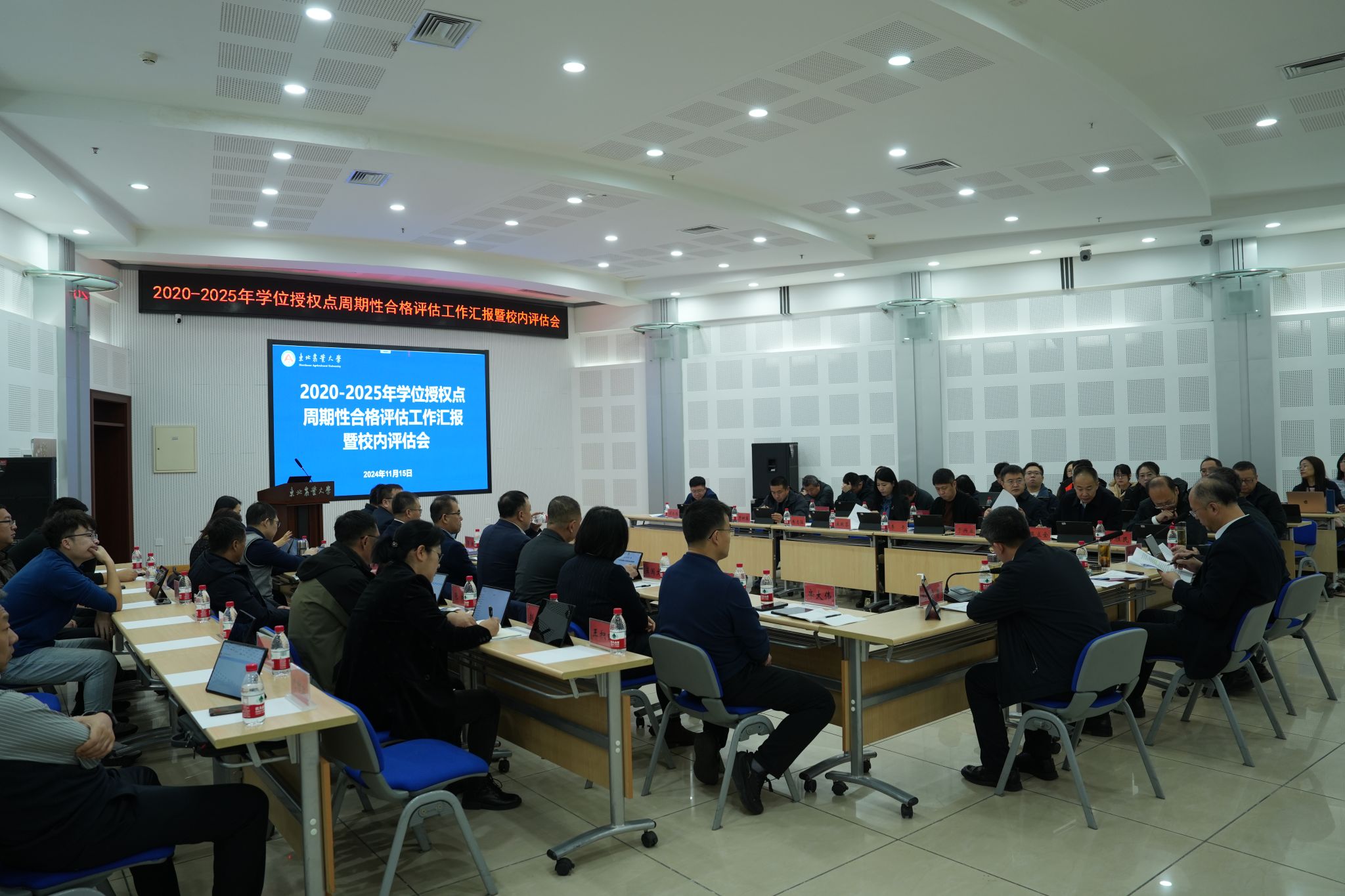 为扎实开展学校2020-2025年学位授权点周期性合格评估工作,全面梳理各参评学位授权点的建设成效,切实提高学位点自评工作质量,确保自评自建取得实效,11月15日,学校在图书馆227室组织召开了2020-2025年学位授权点周期性合格评估工作校内评估会。学校党委书记付强、校长刘竹青、副校长姜毓君,相关职能部处负责人,相关学院负责人、分管研究生工作副院长,各参评学位授权点学科带头人,学科秘书等出席会议。会议由姜毓君主持。