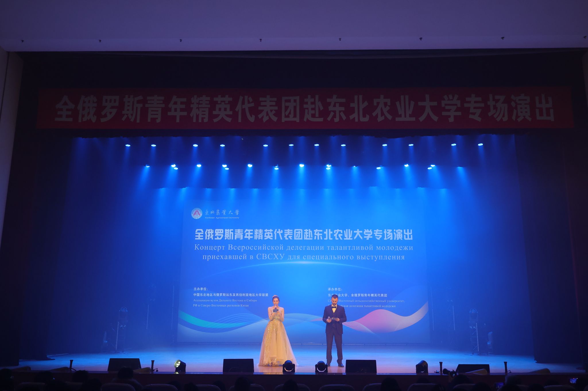 12月7日,俄罗斯青年联邦主席波克罗夫斯基、副主席克里维茨基率领俄罗斯青年精英代表团一行来到东北农业大学举行专场演出。团省委书记徐长勇,省外办副主任刘衍,东北农业大学党委副书记贺景平,副校长陈庆山,学生工作部部长于兴业,校团委书记李卡,国际交流合作处处长卢铁光,艺术学院党委书记于向国、院长刘丹及师生代表等出席活动。本次演出由中国东北地区与俄罗斯远东及西伯利亚地区大学联盟主办,东北农业大学及俄罗斯青年精英代表团承办。