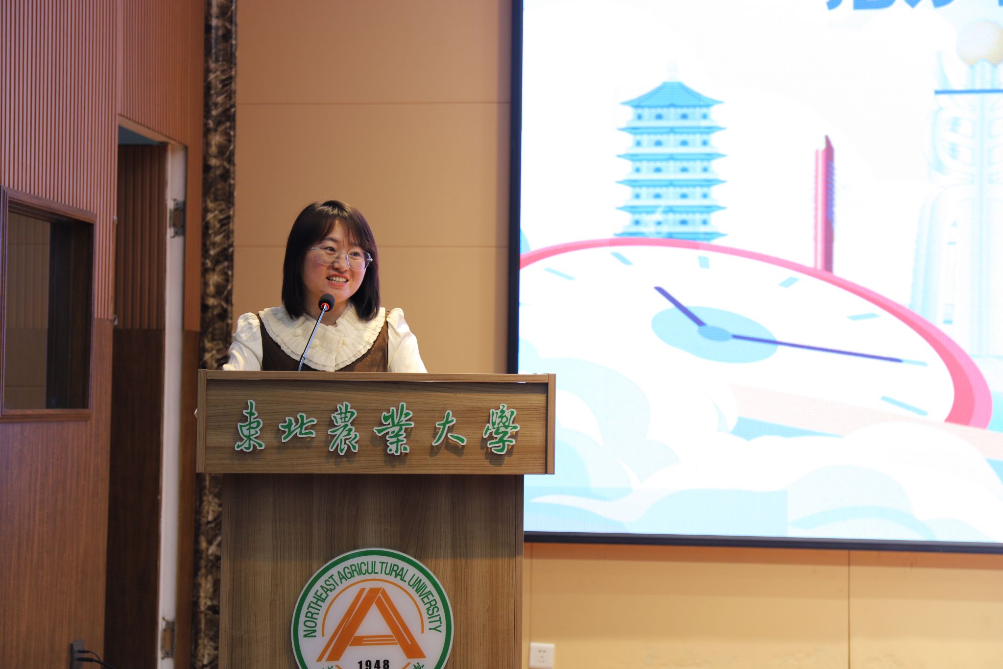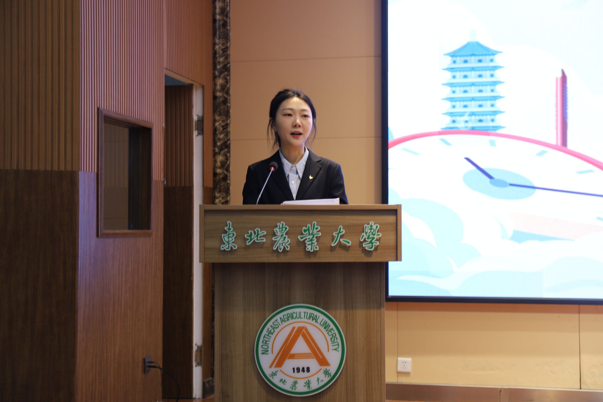 潘俊波代表学校欢迎冯海部长一行莅临我校开展引才宣讲活动,她介绍了东北农业大学的发展历程与人才培养情况。她表示,此次抚远市向广大东农学子发出诚挚邀约,这既是对学校的信任,也是对学校人才培养质量的认可。抚远是一座资源优势巨大,生态优势良好,文旅优势突出,区位优势独特,外贸优势明显的城市,希望同学们以在抚远工作的优秀校友为成长榜样,积极投身抚远市的发展建设,与抚远共同成长、相互成就。