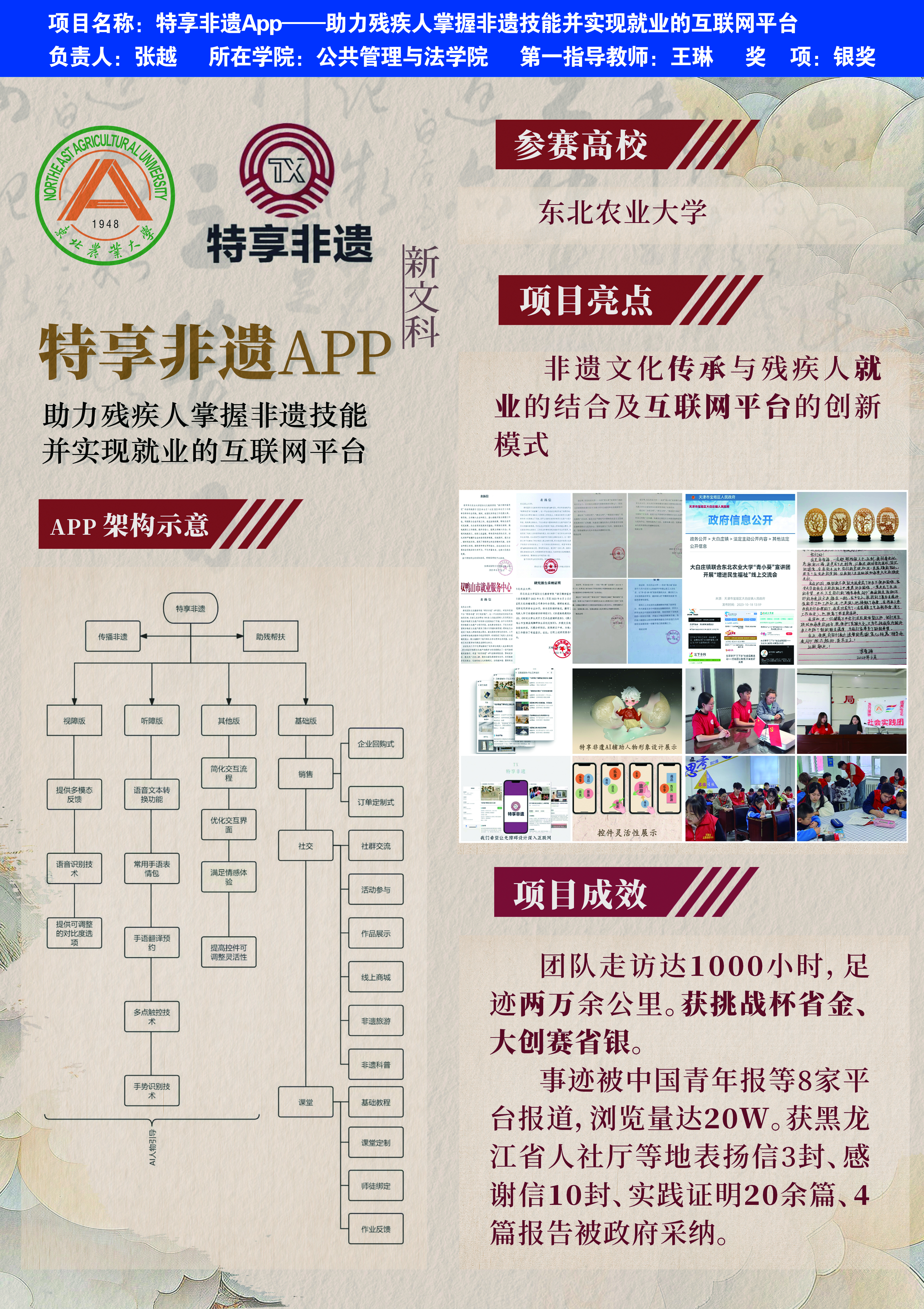 近日,由教育部高等教育司指导,全国新文科教育研究中心委托山东大学主办的“浪潮杯”首届全国大学生新文科实践创新大赛全国赛圆满收官。东北农业大学共有5个项目晋级全国赛现场总决赛,经过激烈角逐,最终获得金奖1项、银奖4项和优秀组织奖1项的优异成绩,艺术学院教师张芳瑜获得优秀指导教师称号。