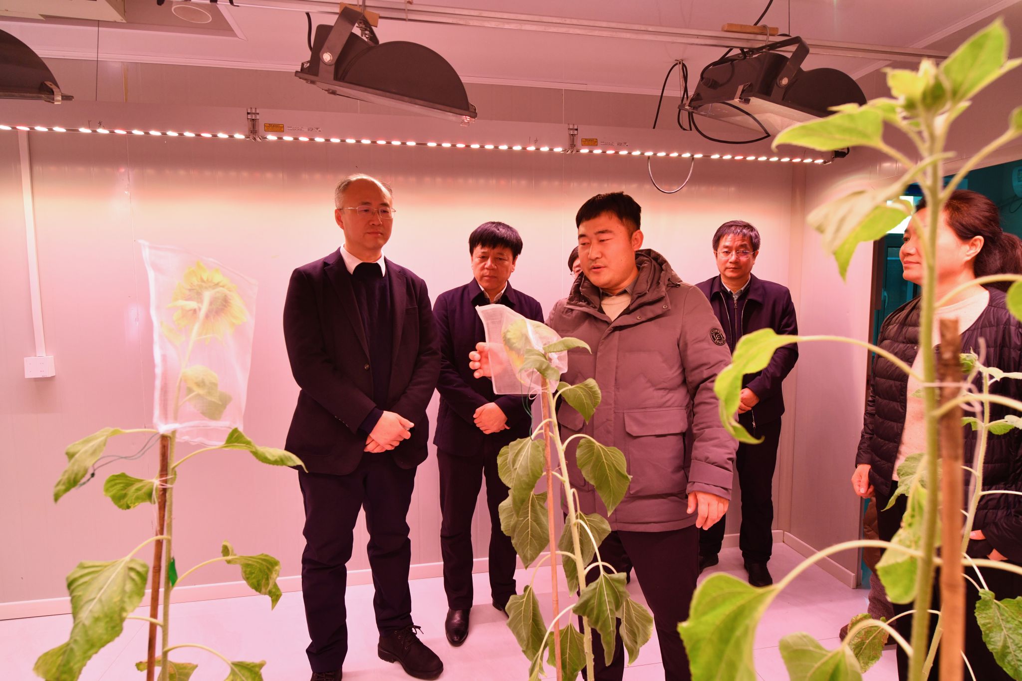 随后,付强一行来到向日葵技术研究中心,调研甘南县向日葵种植情况及向日葵产业发展中科技、人才方面的具体需求。在甘南向日葵菌核病防治过程中,学校的科技力量起到了关键作用。在学校科研团队的助力下,甘南向日葵菌核病的防控工作实现了从曾经的几近失控到如今连年防效超过70%的显著转变,向日葵种植面积有望在2025年恢复至万亩规模。在向日葵接种鉴定室,付强详细询问了学校农学院张忠臣副教授带领的向日葵遗传育种团队在甘南县的最新科研成效,对团队突破性取得向日葵菌核病抗病/感病基因进行了充分肯定,并与我校派驻中心的省级博士后创新实践基地尹燕斌博士进行了交流,提出要扎扎实实、踏踏实实、求真务实的做好科研攻关,解决好一揽子制约甘南向日葵产业发展的重点问题,为甘南中国向日葵之乡的早日振兴持续贡献东农力量。