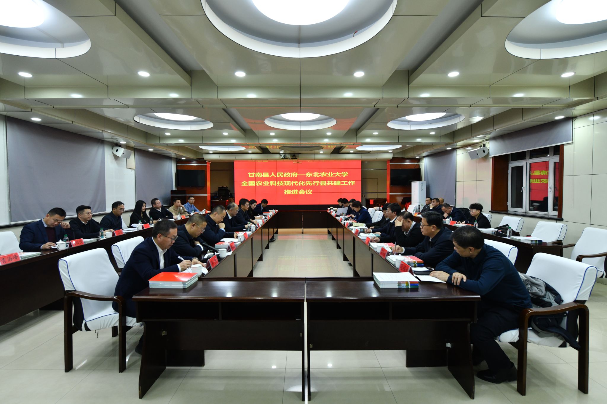 在随后召开的甘南县人民政府-东北农业大学全国农业科技现代化先行县共建工作推进会上,校县双方领导共同审议了《全国农业科技现代化先行县2024年度工作报告》,刘正伟代表先行县共建工作领导小组进行了2024年先行县共建工作的总结。领导小组认为,一年来,校县双方做到了高规格推动、高起点谋划、高标准服务,探索完善了“基地+中心+产业联盟”合作模式,甘南县人民政府通过实施“1234人才梯队战略”,强化梯队培养、资金保障及政策支持,夯实了共建基础;东北农业大学依托科技、人才优势,组织14个学院、5个职能部门、32个科研团队和94名专家实施产业类、人才类、攻关类项目35项。双方共同打造了县乡村三级农业科技示范园区122个,引进新技术、新品种123项,实施推广面积近万亩;辐射带动全县智慧农(牧)场11个,甘南县农业信息化率提高到25.6%;筹建大豆、向日葵、浆果等科技小院3个;落实土地托管面积50万亩,辐射带动全县规模化经营面积达200万亩,综合机械化作业总体水平达到99.43%;打造美丽休闲乡村2个、乡村振兴示范村5个,欢喜村入选省级宜居宜业和美乡村精品村名录;组建126支实践团队、880名学生,围绕110个主题开展“三下乡”社会实践甘南专项。基于2024年的务实合作,校县双方集中解决了一批技术难题,建设了一批展示基地,创建了一批智慧园区,打造了一批服务平台,扶持了一批经营主体,打造了一批和美乡村,培养了一批创业人才,为龙江县域农业科技现代化发展,发挥了先行先试的重要作用。