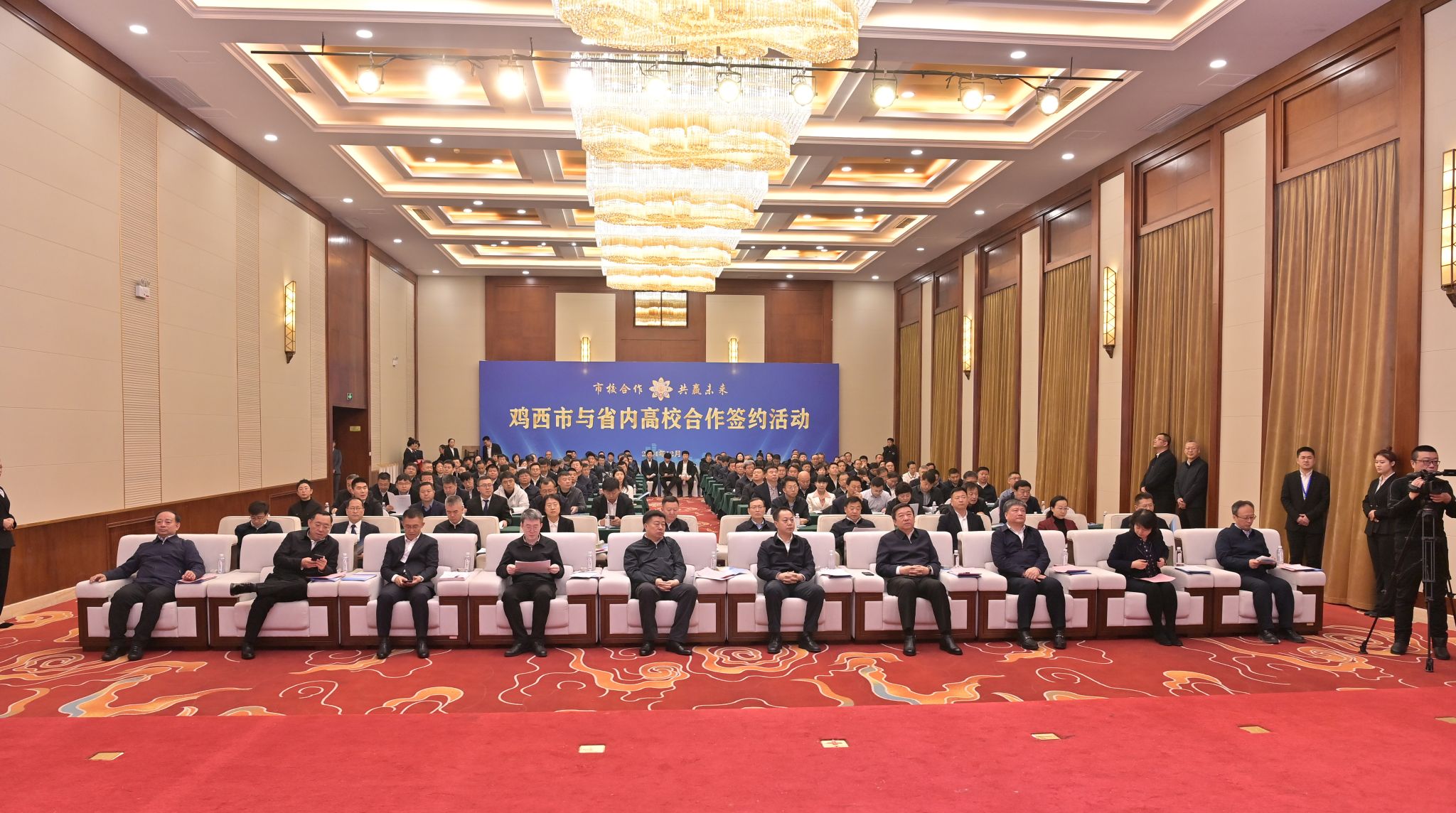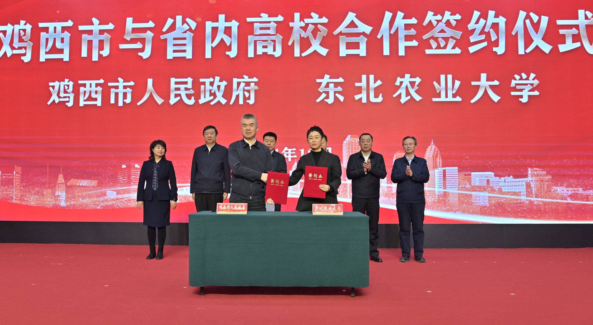 为深入贯彻落实习近平总书记在新时代推动东北全面振兴座谈会上的重要讲话和在视察黑龙江期间重要讲话重要指示精神,围绕“以科技创新引领产业全面振兴”的工作要求,聚焦实施创新驱动发展战略,推动科技创新与产业创新深度融合,加快形成新质生产力,助力高校先进创新成果转化落地鸡西。12月28日,东北农业大学副校长姜毓君、招生就业处处长潘俊波、黑龙江省绿色食品科学研究院副院长杨文敏等一行5人参加鸡西市与省内8所高校共建合作签约仪式。省委教育工委副书记王震,省委组织部有关处室负责同志,省内合作高校相关领导,鸡西市市委书记鲁长友,市委副书记、市长孙成坤,市委组织部部长谢喆及市政府相关领导、各县(市)区、市直部门及企业单位相关负责同志等近200人参加签约仪式。谢喆主持签约仪式。