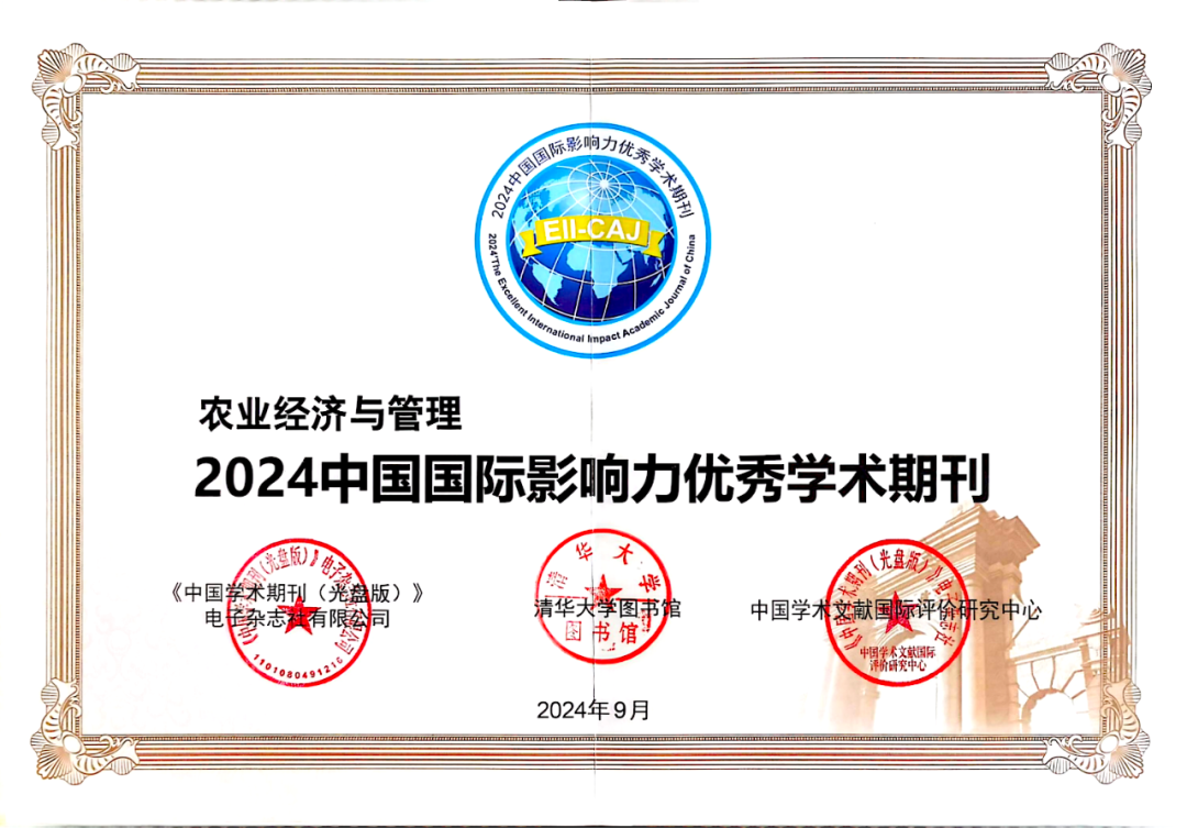 根据《中国学术期刊国际引证年报(2024版)》,东北农业大学《农业经济与管理》期刊国际影响力指数跃升至58.548,首次入选“2024中国国际影响力优秀学术期刊” (人文社会科学·中文),成为全国人文社科门类70种入选期刊之一。