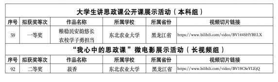 近日,习近平新时代中国特色社会主义思想大学习领航计划主题教育系列活动获奖名单出炉。由我校马克思主义学院报送的《粮稳民安韵悠长,农校学子勇担当——以科技人才赋能黑龙江粮食生产高质量发展为例》《菽香》两部作品分别荣获第八届全国高校大学生讲思政课公开课展示活动全国一等奖和第八届全国高校大学生微电影展示活动全国二等奖,实现了我校在大学生讲思政课和微电影两项赛事上的历史性突破。